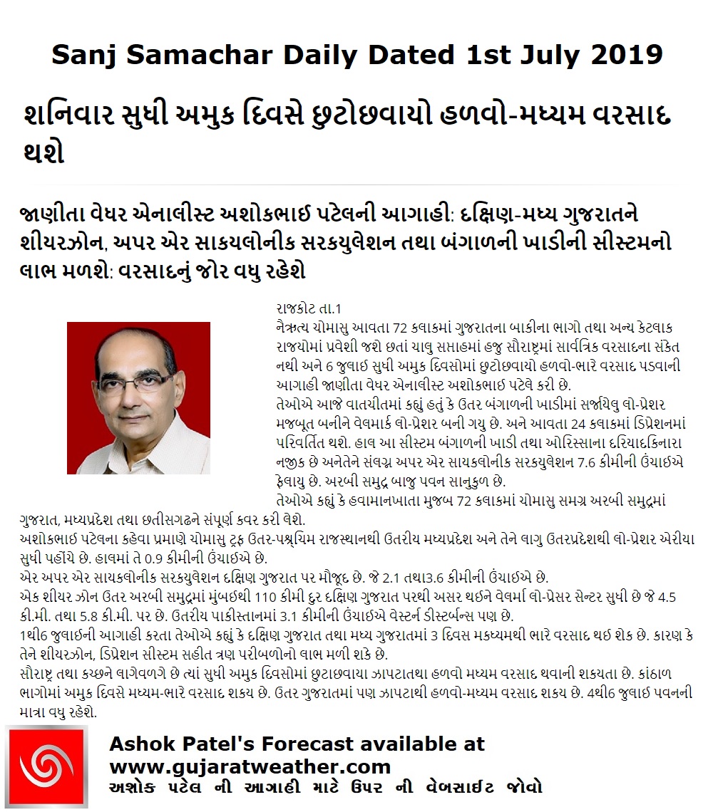 Well Marked Low Pressure Now Over Northwest Bay Of Bengal Near Coastal Odisha & West Bengal – Expected To Concentrate To A Depression By Tomorrow & Will Track Towards Madhya Pradesh – Update 1st July 2019