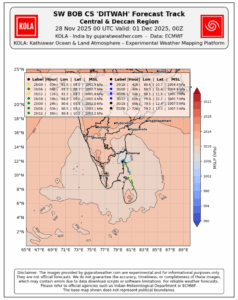 ECMWF 28-11-2025 00 UTC Run Forecast Track Of Cyclonic Storm ‘DITWAH’ Over Southwest Bay Of Bengal