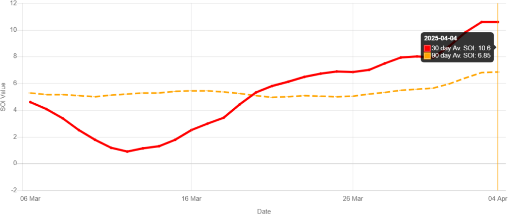 Recent (preliminary) Southern Oscillation Index values as per The Long Paddock – Queensland Government.