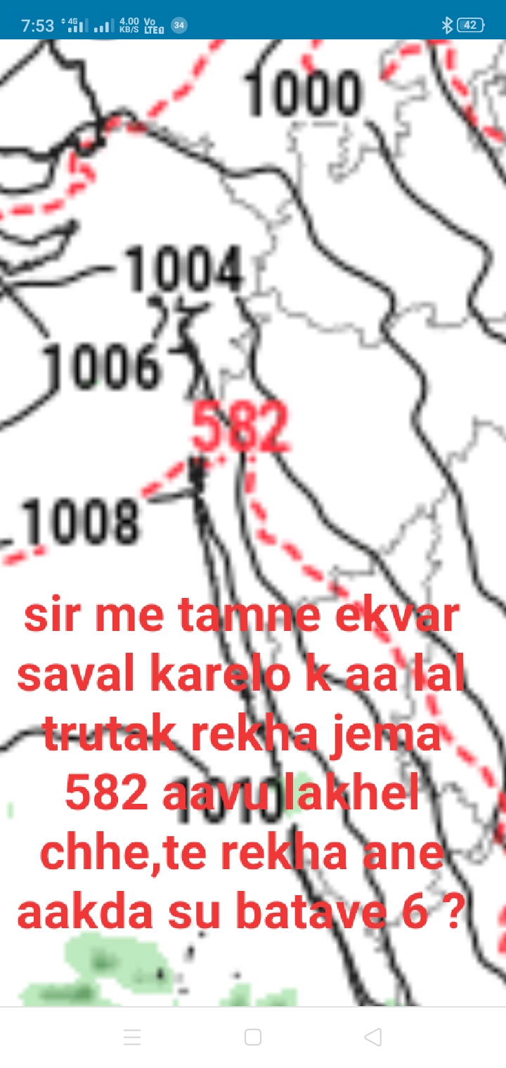 આ ફોટામાં 500mb ઉંચાઈ દર્શાવે છે વાતાવરણ જેમ જેમ ઉપર જાય તેમ તેમ વાતાવરણ નું દબાણ ઘટતું જાય આપણે સરફેસ લેવલ વાતાવરણ નું દબાણ 1000MB આસપાસના હોય છે જે શિયાળામાં તેના થી વધુ હોય છે આ દબાણ 500MB કેટલી ઉંચાઈ પર છે તે આ ફોટા માં દર્શાવે છે આ ફોટામાં 582 બતાવે છે એટલે 582 dam કે thickness હોય તે સરેરાશ સમુદ્ર સપાટીથી ઉંચાઈ કેટલી છે એ જોવા માટે 1 ડેકેમીટર = 10 મીટર એટલે 582 ડેકેમીટર= 5820 મીટર થયું એટલે 500mb પ્રેશર સરેરાશ સમુદ્ર સપાટીથી 5820 મીટર પર છે એવો અર્થ થાય સર માહિતી સાચી અને યોગ્ય હોય તો… Read more »