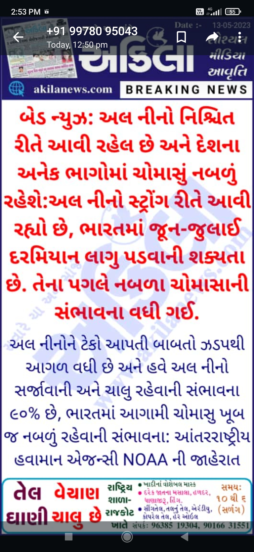 તારીખ 17 મે 2023આજની પરિસ્થિતિ ભારતીય હવામાન વિભાગ અનુસાર મીડ ડે બુલેટિન ▪️ આગામી 2 દિવસ દરમિયાન નૈઋત્ય નુ ચોમાસુ દક્ષિણ બંગાળની ખાડી, દક્ષિણ આંદામાન સમુદ્ર અને નિકોબાર ટાપુઓના કેટલાક ભાગોમાં બેસી જાય તેવી સંભાવના છે.▪️વેસ્ટર્ન ડિસ્ટર્બન્સ હવે જમ્મુ અને કાશ્મીર પર UAC તરીકે છે અને તે સરેરાશ સમુદ્ર સપાટીથી 3.1 અને 7.6 કિમી વચ્ચે છે. ▪️ ઉત્તર બિહારથી મધ્ય છત્તીસગઢ સુધીનો ટ્રફ યથાવત છે અને તે હવે સરેરાશ સમુદ્ર સપાટીથી 3.1 કિમી સુધી વિસ્તરે છે. ▪️ એક વેસ્ટર્ન ડિસ્ટર્બન્સ મીડ અને અપર લેવલ ના પશ્ચિમી પ્રવાહો માં ટ્રફ તરીકે તેની ધરી સાથે સરેરાશ સમુદ્ર સપાટીથી 5.8 કિમી ની ઊંચાઈ… Read more »