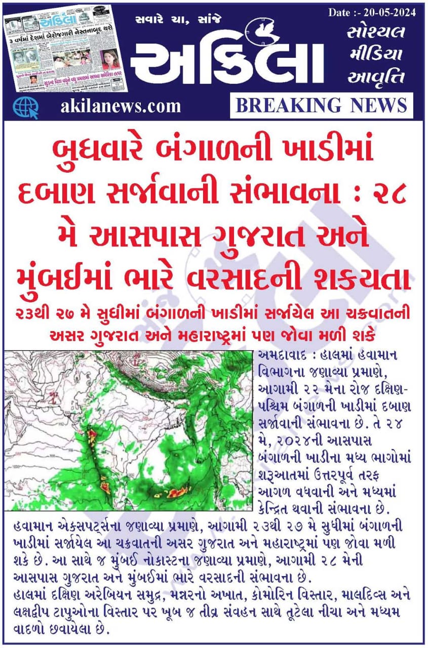 તારીખ 23 મે સુધી માં દક્ષિણ બંગાળ ની ખાડી માં લો પ્રેસર થવાની શક્યતા છે.