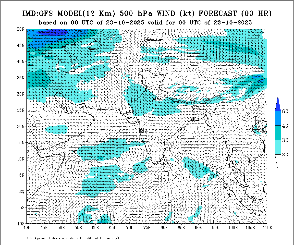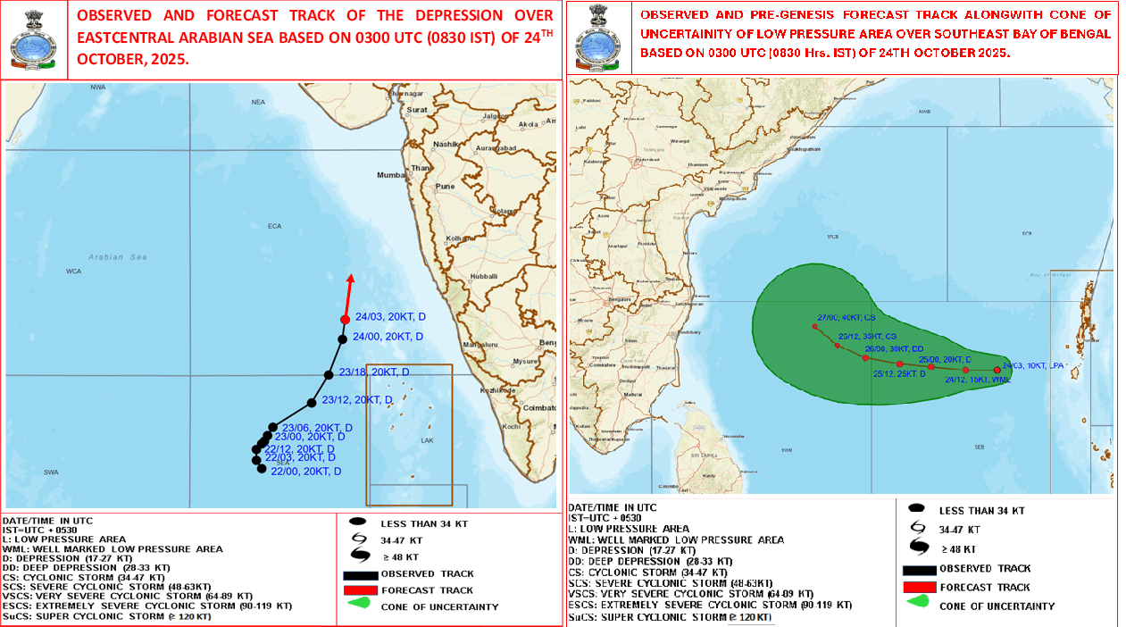 The Depression over the southeast Arabian Sea moved slowly northeastwards with a speed of about 5 kmph during the past 6 hours and lay centered at 0830 hrs IST of today, the 23rd October 2025, over the same region, near latitude 9.8°N and longitude 67.8°E. It was located approximately 560 km west-southwest of Aminidivi (Lakshadweep) and 910 km southwest of Panjim (Goa). It is likely to move nearly north-northeastwards across the southeast Arabian Sea towards the east-central Arabian Sea during the next 24 hours.