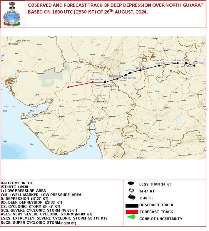 IMD Observed & Forecast Track of Deep Depression Over North Gujarat & Vicinity on 26th August 11.30 pm. (Night)