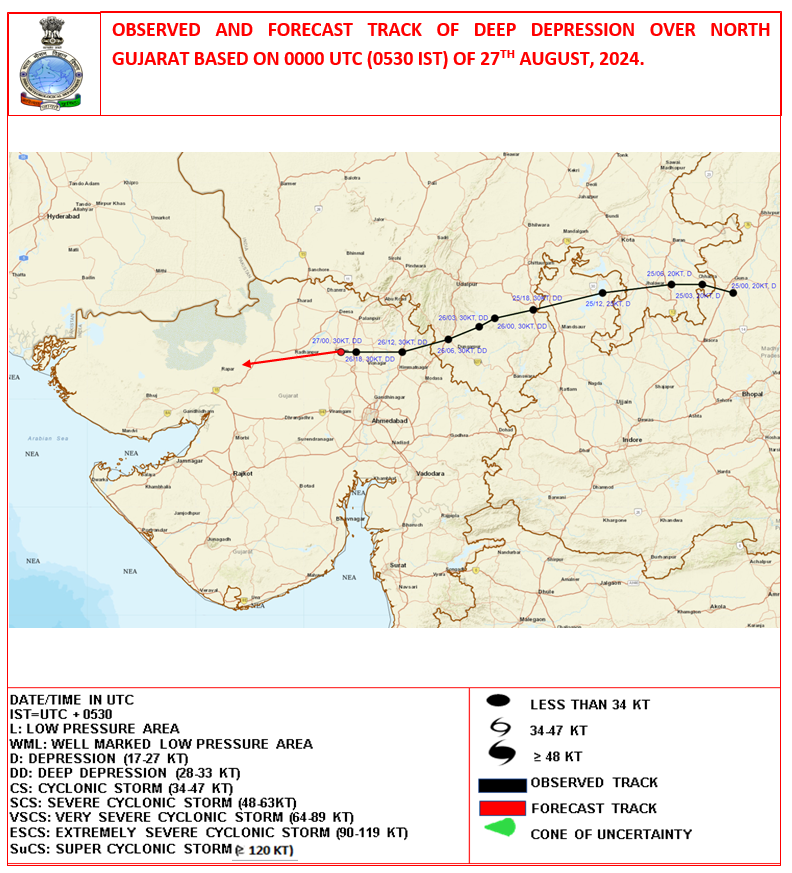 Observed & Forecast Track of Deep Depression over North Gujarat on 27th August 2024 at 05.30 am. IST