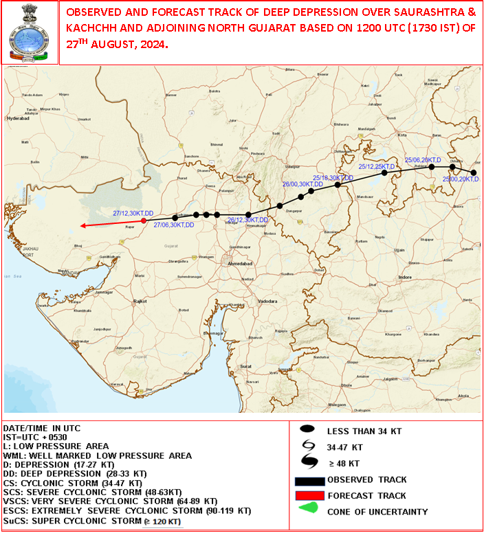 Check for specifics for Observed & Forecast Track of Deep Depression, District wise warning for Gujarat, Flash Flood Guidance etc. on Main update above