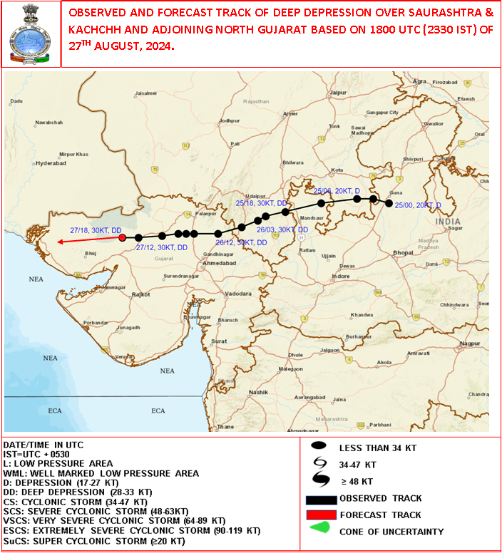 Check for specifics for Observed & Forecast Track of Deep Depression, District wise warning for Gujarat, Flash Flood Guidance etc. on Main update above
