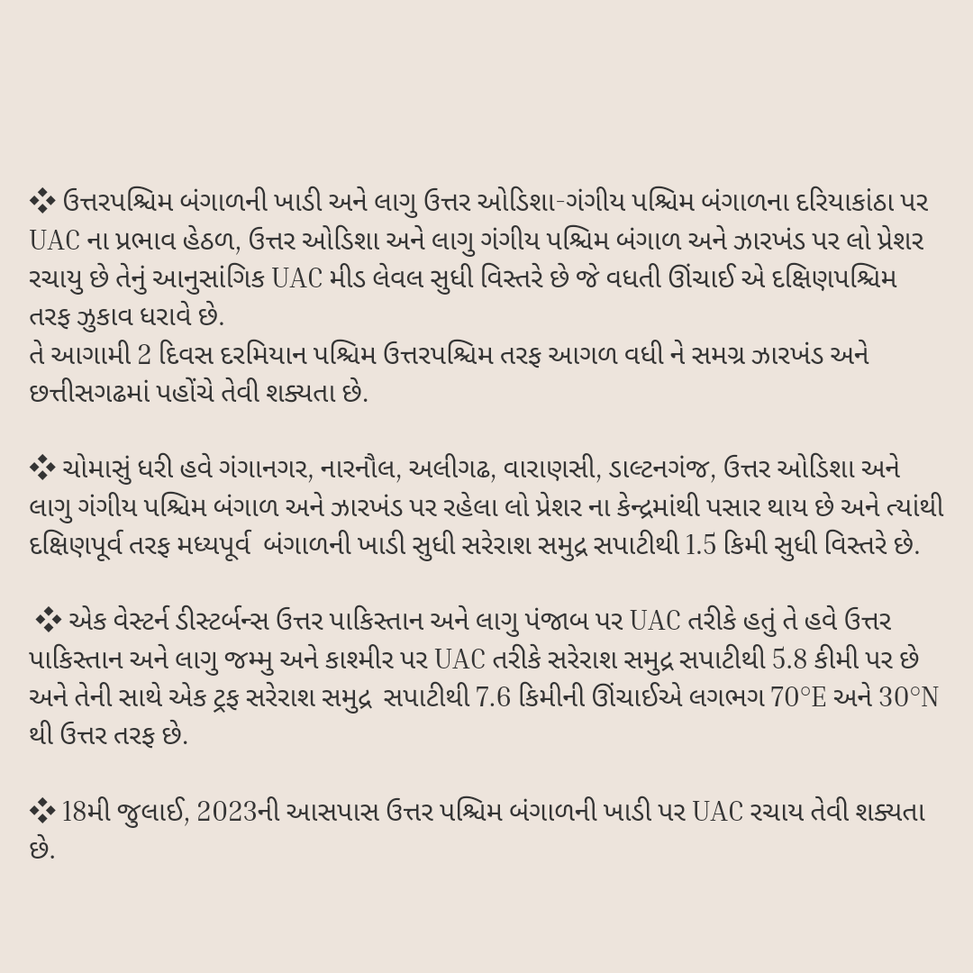 18મી જુલાઈ, 2023 ની આસપાસ ઉત્તર પશ્ચિમ બંગાળની ખાડી ઉપર વધુ એક ફ્રેશ UAC રચાય તેવી શક્યતા છે.