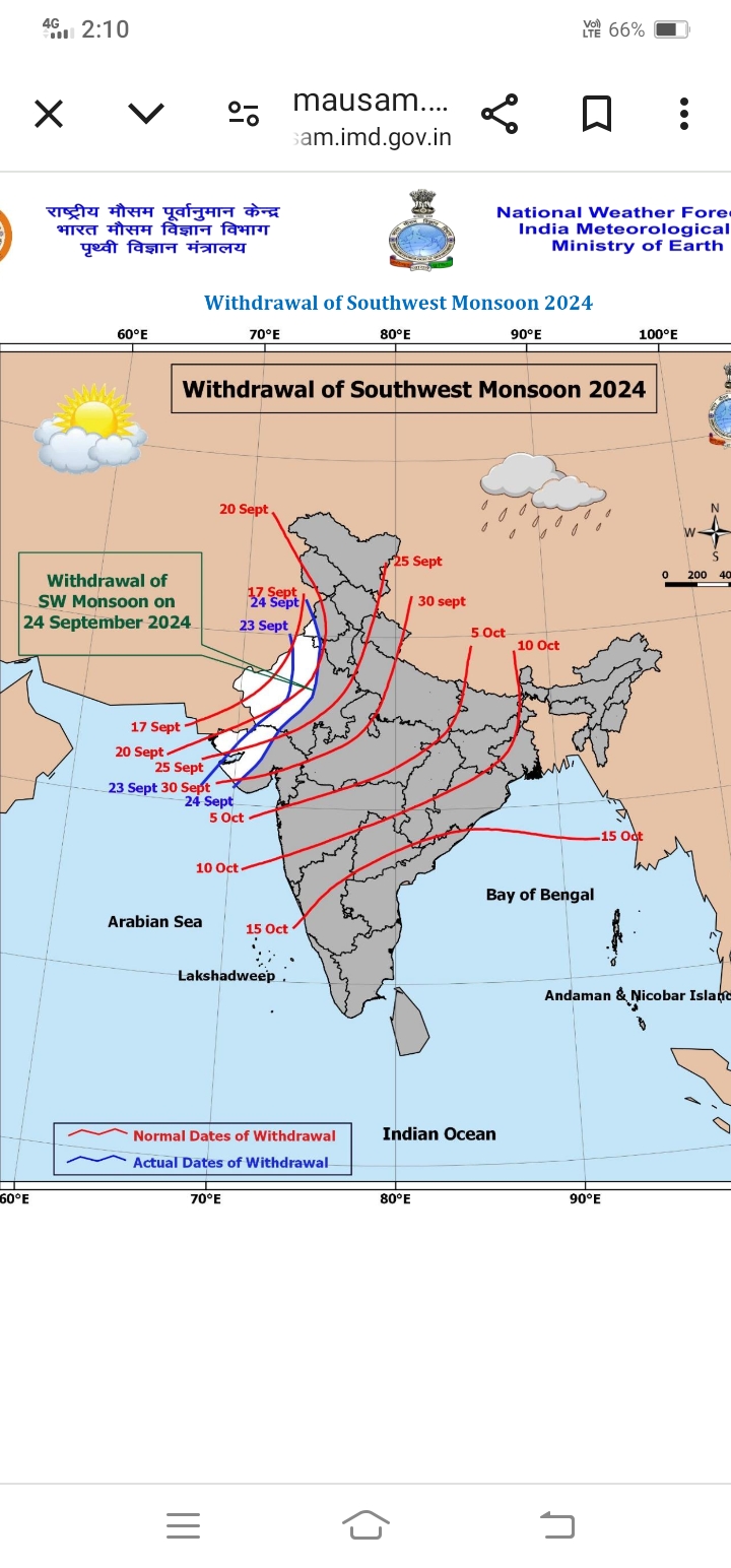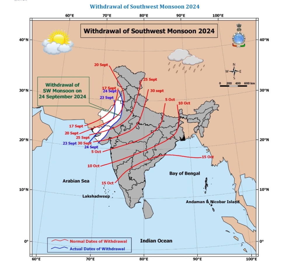 Southwest monsoon has withdrawn from some parts of West Rajasthan and Kachchh, today, the 23rd September, 2024 against the normal date of 17th September.
