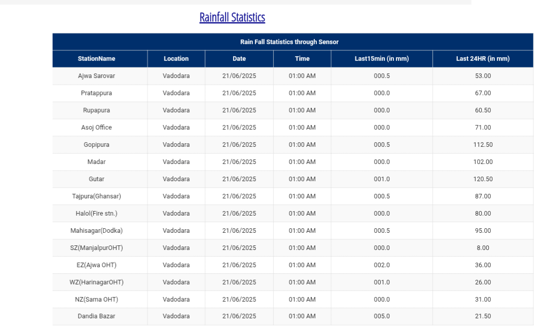 Vadodara district na ghana centre ma 8mm thi 120mm sudhi no saanj thi 1:00am sudi no rainfall data