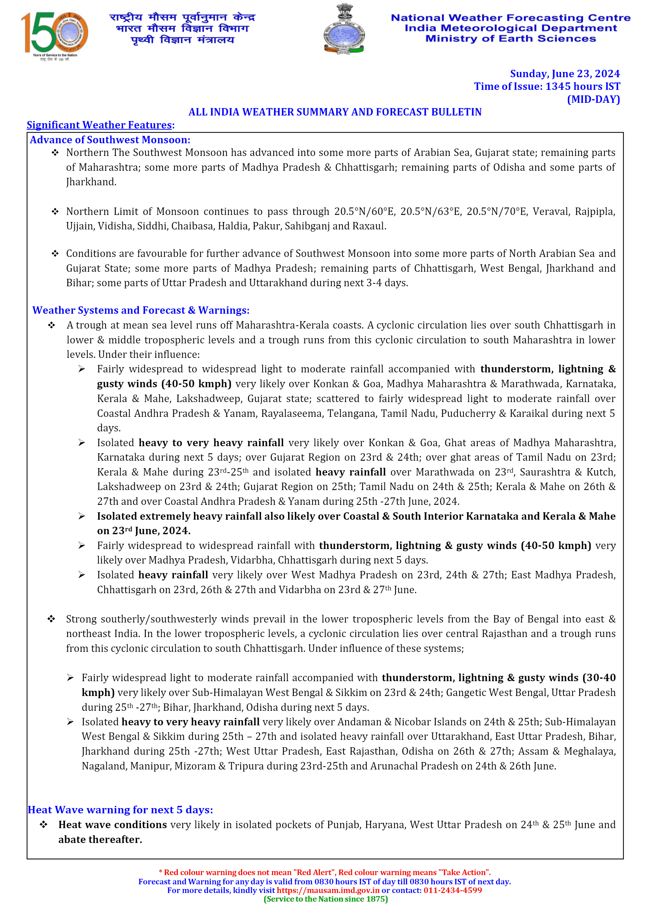 Press Release 22-06-2024The Northern Limit of Monsoon continues to pass through 20.5°N/60°E, 20.5°N/63°E, 20.5°N/70°E, Navsari, Jalgaon, Mandla, Pendra Road, Jharsuguda, Balasore, Haldia, Pakur, Sahibganj and Raxaul.