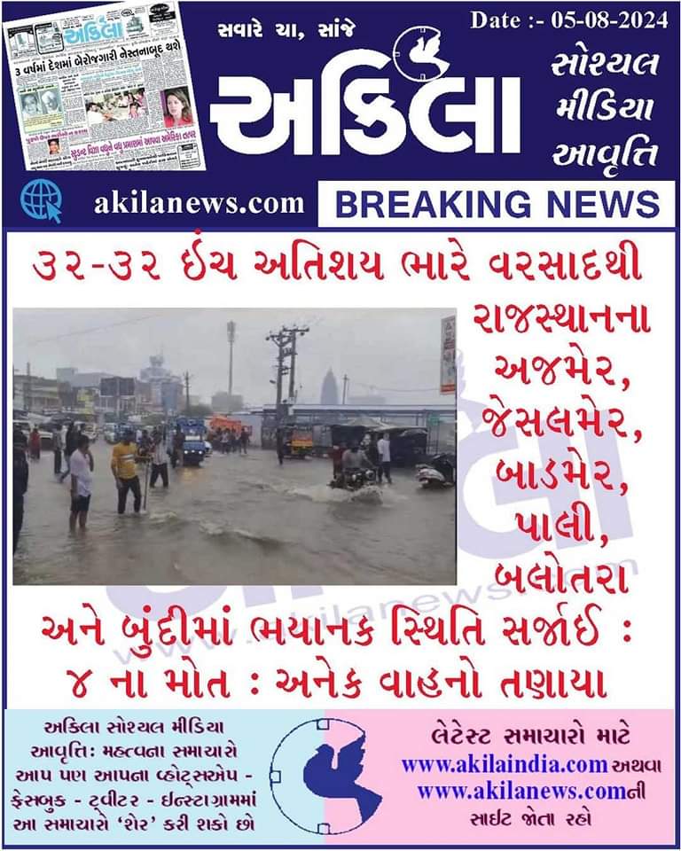 તારીખ 5 ઓગસ્ટ 2024 આજની પરિસ્થિતિ ભારતીય હવામાન વિભાગ અનુસાર મીડ ડે બુલેટિન ❖ ઉત્તરપૂર્વ રાજસ્થાન અને લાગુ ઉત્તરપશ્ચિમ મધ્ય પ્રદેશ પરનું ડિપ્રેસન છેલ્લા 6 કલાક દરમિયાન 22 કિમી પ્રતિ કલાકની ઝડપે પશ્ચિમ-ઉત્તરપશ્ચિમ તરફ આગળ વધ્યું હતું અને આજે, 5મી ઓગસ્ટ 2024 ના રોજ ભારતીય સમયાનુસાર સવારે 08:30 કલાકે ઉત્તરપૂર્વ રાજસ્થાન અને તેના આસપાસના વિસ્તાર અક્ષાંશ 26.5°N અને રેખાંશ 75.6°E કેન્દ્રિત હતું. જે જયપુર (રાજસ્થાન)થી લગભગ 40 કિમી દક્ષિણ-દક્ષિણપશ્ચિમમાં, અજમેર (રાજસ્થાન)થી 100 કિમી પૂર્વમાં, સીકર (રાજસ્થાન)થી 130 કિમી દક્ષિણ-દક્ષિણપૂર્વમાં અને બિકાનેર (રાજસ્થાન)થી 280 કિમી દક્ષિણપૂર્વમાં હતુ. આ સીસ્ટમ સમગ્ર ઉત્તર રાજસ્થાનમાં પશ્ચિમ-ઉત્તરપશ્ચિમ તરફ આગળ વધવાનું ચાલુ રાખે છે અને આગામી 12 કલાક… Read more »