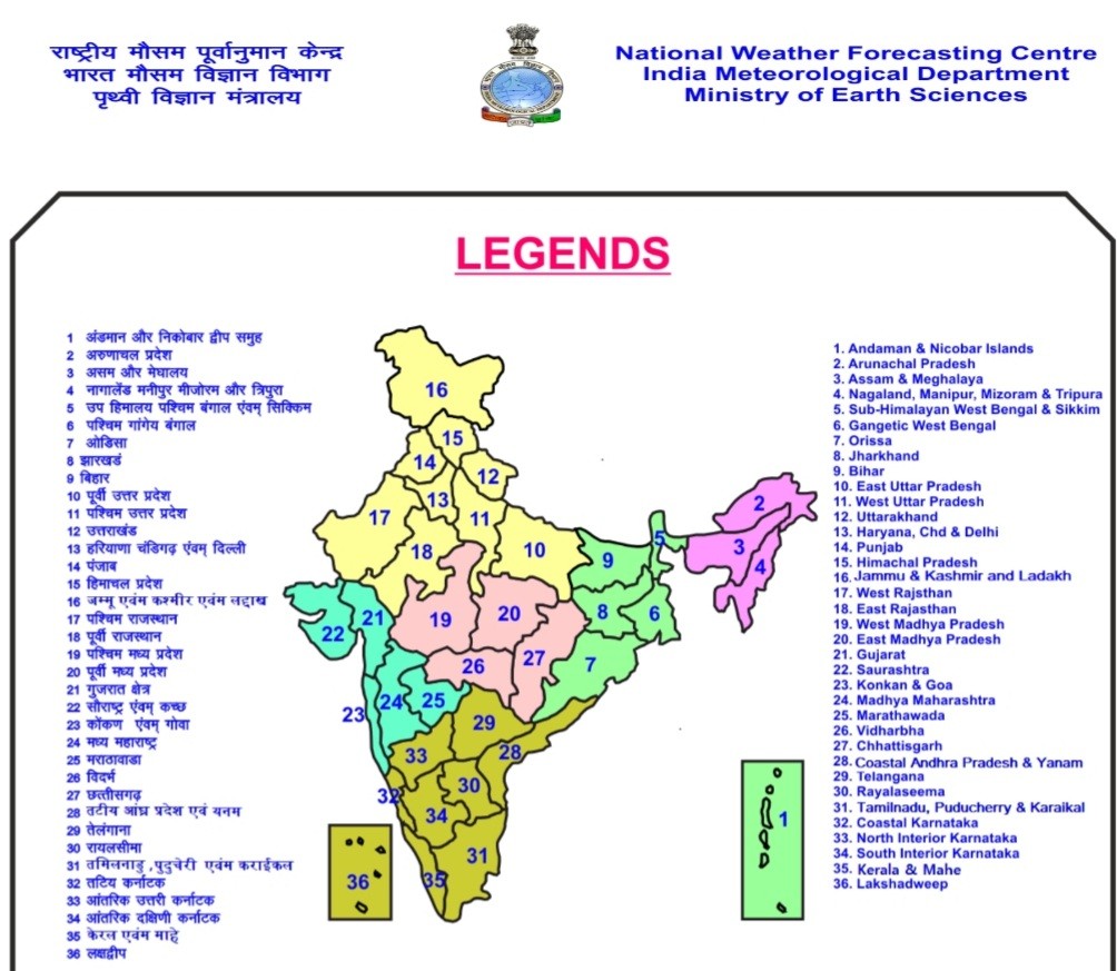 ભારત દેશ વિશાળ અને અલગ અલગ આબોહવા છે.એમાં આગાહી કરવા નું સરળ પડે એટલે નીચે નકશા માં આપ્યા એવી રીતે વિભાગ પાડ્યા છે, હવામાન ખાતા એ.