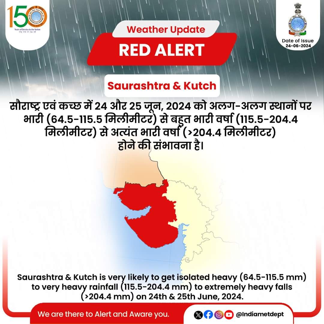 Red Alert by IMD – Saurashtra & Kutch is very likely to get isolated heavy (64.5-115.5 mm) to very heavy rainfall (115.5-204.4 mm) to extremely heavy falls (>204.4 mm) on 24th & 25th June, 2024.