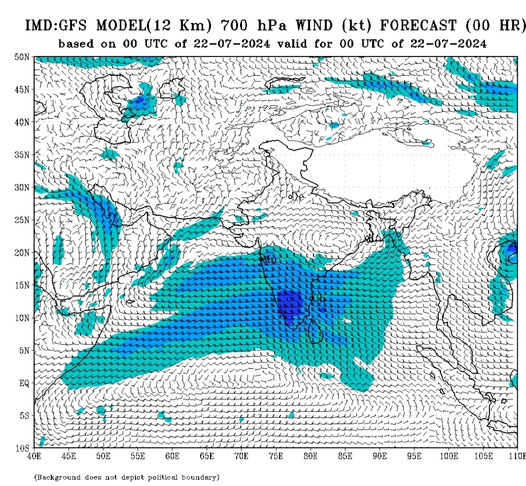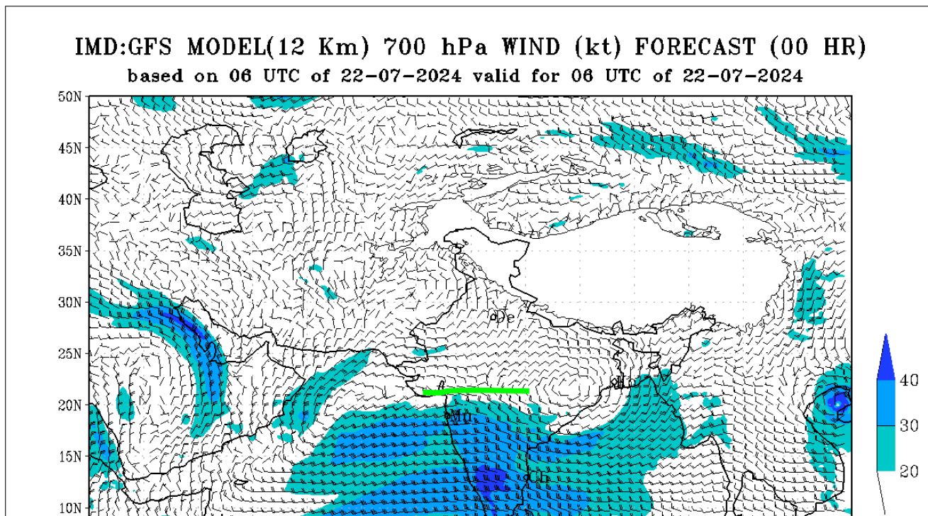 Saurashtra, Gujarat and Kutch: Due to favorable weather parameters the next round of rainfall is expected during the forecast period. The UAC associated with the Bay of Bengal System will interact with the UAC over Gujarat State. Initially Gujarat Region will benefit from these conditions. The main spell of Rainfall expected during 22nd to 25th July 2024 over fairly widespread areas of Gujarat State. Depending upon the location of the UAC associated with the Bay of System when over or in vicinity of Madhya Pradesh and UAC over Gujarat State and vicinity, Isolated areas expected to get very high or extreme rainfall exceeding 200 mm. cumulative during the forecast period. Windy conditions expected on most days of the forecast period.