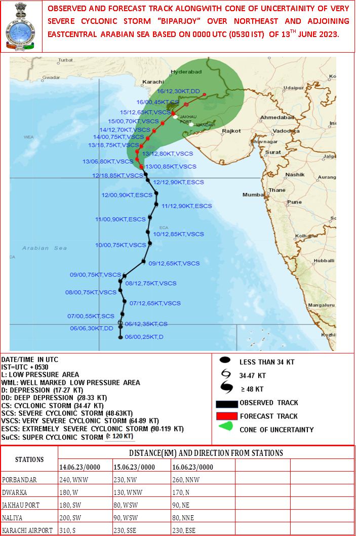 It is very likely to move nearly northward till 14th morning, then move northnortheastwards and cross Saurashtra & Kutch and adjoining Pakistan coasts between Mandvi (Gujarat) and Karachi (Pakistan) around noon of 15th June as a very severe cyclonic storm with maximum sustained wind speed of 125-135 kmph gusting to 150 kmph.