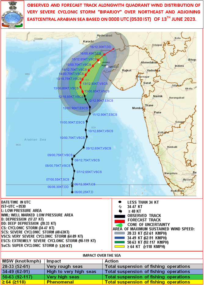 IMD Cyclone Track & Forecast Track and Wind Quadrant @ 5.30 am. 13th June 2023
