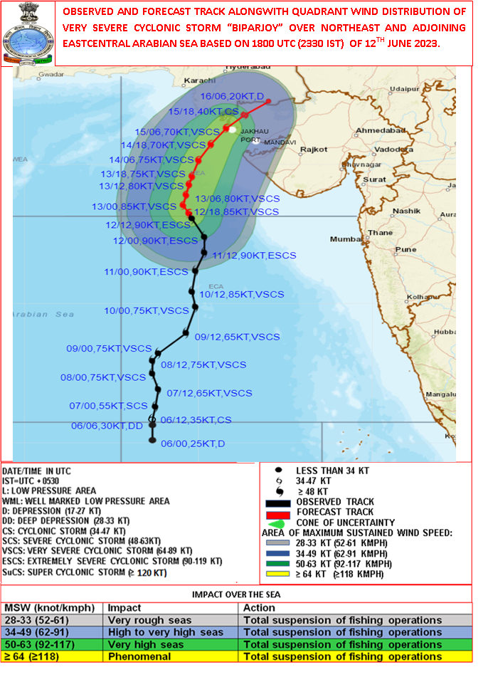 IMD Cyclone Track & Forecast Track and Wind Quadrant @ 11.30 pm. 12th June 2023