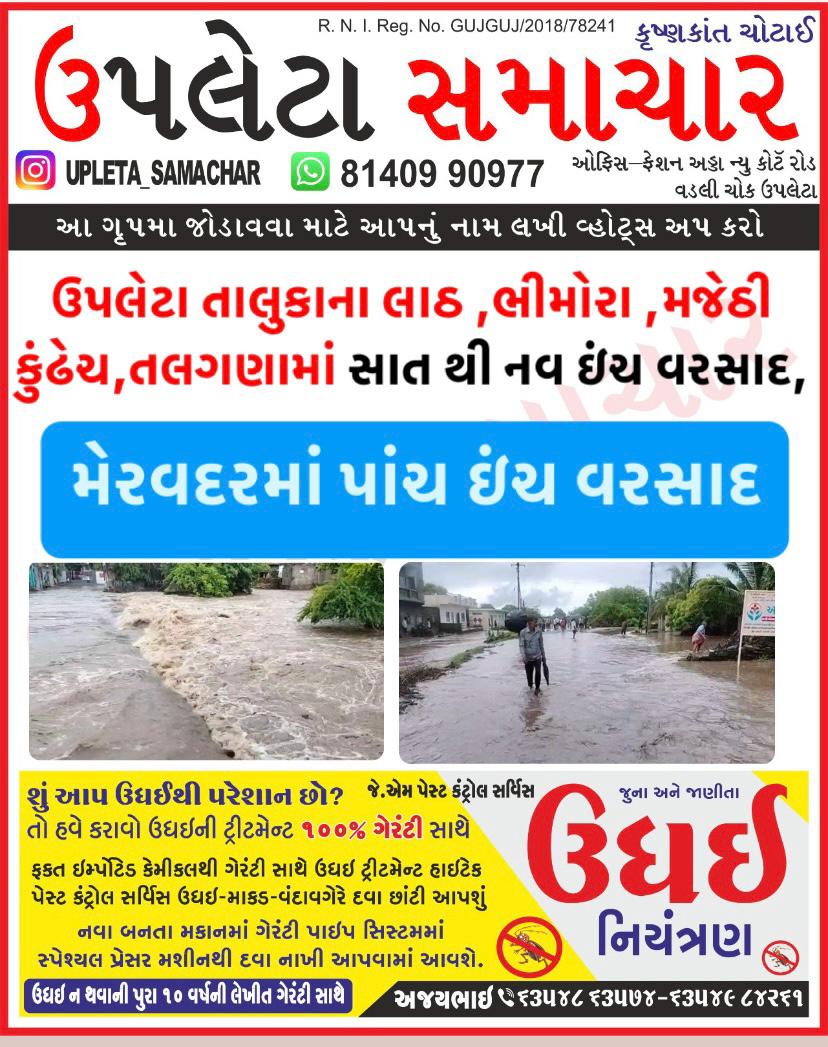 જય શ્રીકૃષ્ણ’ સર’ અને બધા મીત્રો આજે અમારે સવારથી મેઘરાજીએ મંડાણ કર્યાં હતા’ ‘સવારે આઠ વાગ્યે શરૂ થયેલ અને નવ વાગેથી દસ વાગ્યા સુધી લીવર દીધું કડાકા ભડાકા સાથે ટોટલ ચારથી પાંચ ઇંચ પડી ગયો ડુંગરના બધા તળાવો ઓવરફ્લો, નીચેના તળાવા પણ ભરાઇ ગયા અને ટપકેશ્વર મહાદેવનો ધોધ જોરદાર ચાલુ છે ” (ઓસમ હીલ’ પર્યટન સ્થળ. પાટણવાવ)