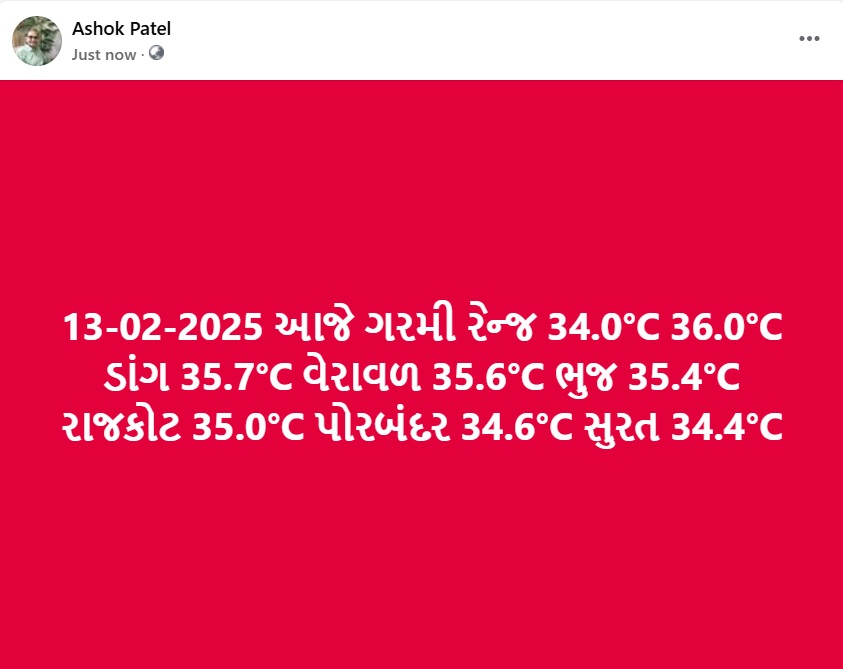 સૌરાષ્ટ્ર, ગુજરાત અને કચ્છમાં તાપમાન સામાન્ય કરતાં ઉંચું રહેવાની શક્યતા – 15થી 18 ફેબ્રુઆરી 2025 દરમિયાન 35°C થી 38°C સુધી વધવાની સંભાવના