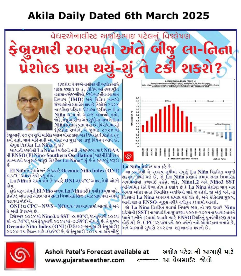 વિવિદ્ધ આંતરરાષ્ટ્રીય હવામાન એજન્સીઓ, જેમાં ભારતીય હવામાન વિભાગ (IMD) અને વિવિધ ખાનગી સંસ્થાઓનો સમાવેશ થાય છે, તેઓએ 2024 ના દક્ષિણ પશ્ચિમ ચોમાસા દરમિયાન La Niña ઘટવાનો અંદાજ લગાવ્યો હતો. જોકે, ફેબ્રુઆરીના અંત સુધીમાં માત્ર બે La Niña થ્રેશોલ્ડ પ્રાપ્ત થયા છે. વિરોધાભાસી દૃષ્ટિકોણ રાખીને, મેં જુલાઈ 2024 થી ફેબ્રુઆરી 2025 સુધી માસિક બ્લોગ પોસ્ટ દ્વારા એક વિપરીત દૃષ્ટિકોણ રજૂ કર્યો હતો. માર્ચ મહિનાની આ પોસ્ટ આ મુદ્દા પર તાજું વિવેચન આપે છે.