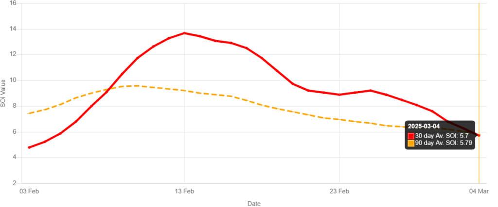 The 30 Days average SOI for end of February 2025 was at 7.14, however, on 4th March 2025 it has decreased and is in the neutral zone at +5.7 as per The Long Paddock – Queensland Government. The 90 Days average SOI has decrease to +5.79 on 4th March 2025. Currently, both 30 Days as well as the 90 Days average SOI is on a declining trend.