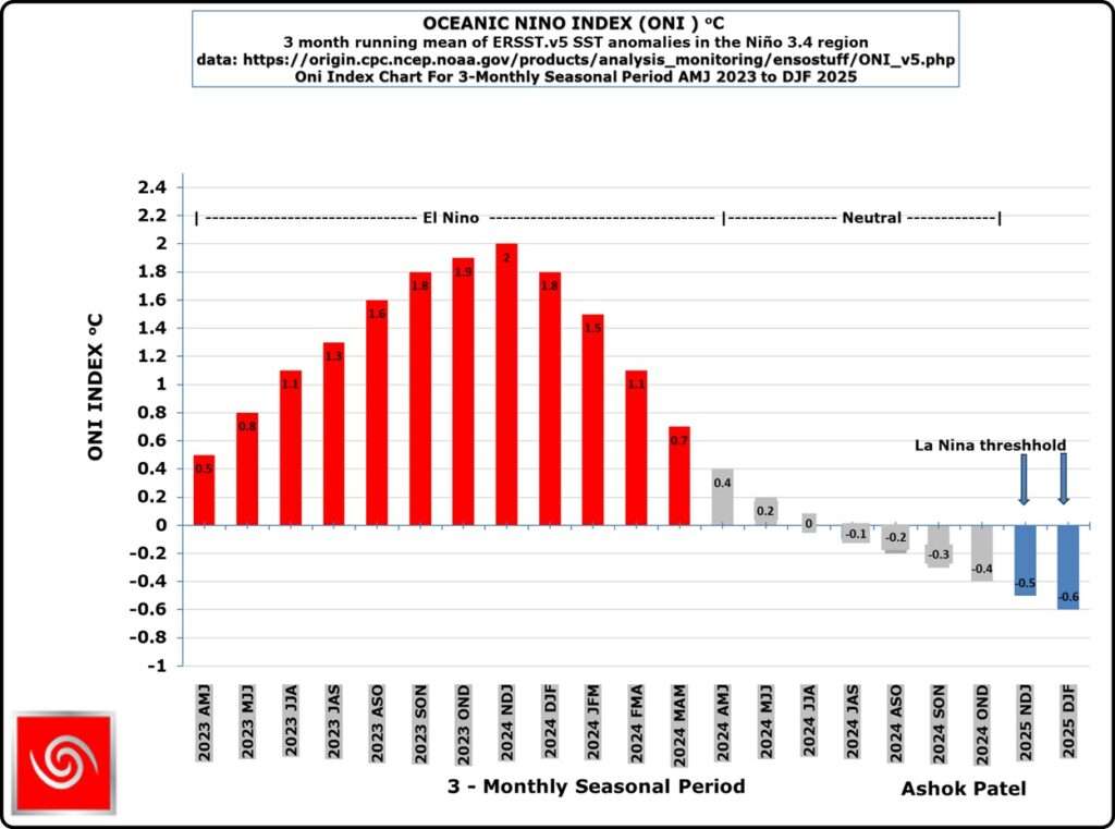 ડિસેમ્બર 2024 માં Niño3.4 SST -0.60°C, જાન્યુઆરી 2025 માં -0.74°C, અને ફેબ્રુઆરી 2025 માં -0.59°C નોંધાયું છે. તે મુજબ Oceanic Niño Index (ONI) (ડિસેમ્બર-જાન્યુઆરી-ફેબ્રુઆરી) 2024-25 સિઝન માટે -0.6°C છે, જે ફેબ્રુઆરી 2025 ના અંતે બીજું La Niña થ્રેશોલ્ડ પ્રાપ્ત કરે છે.