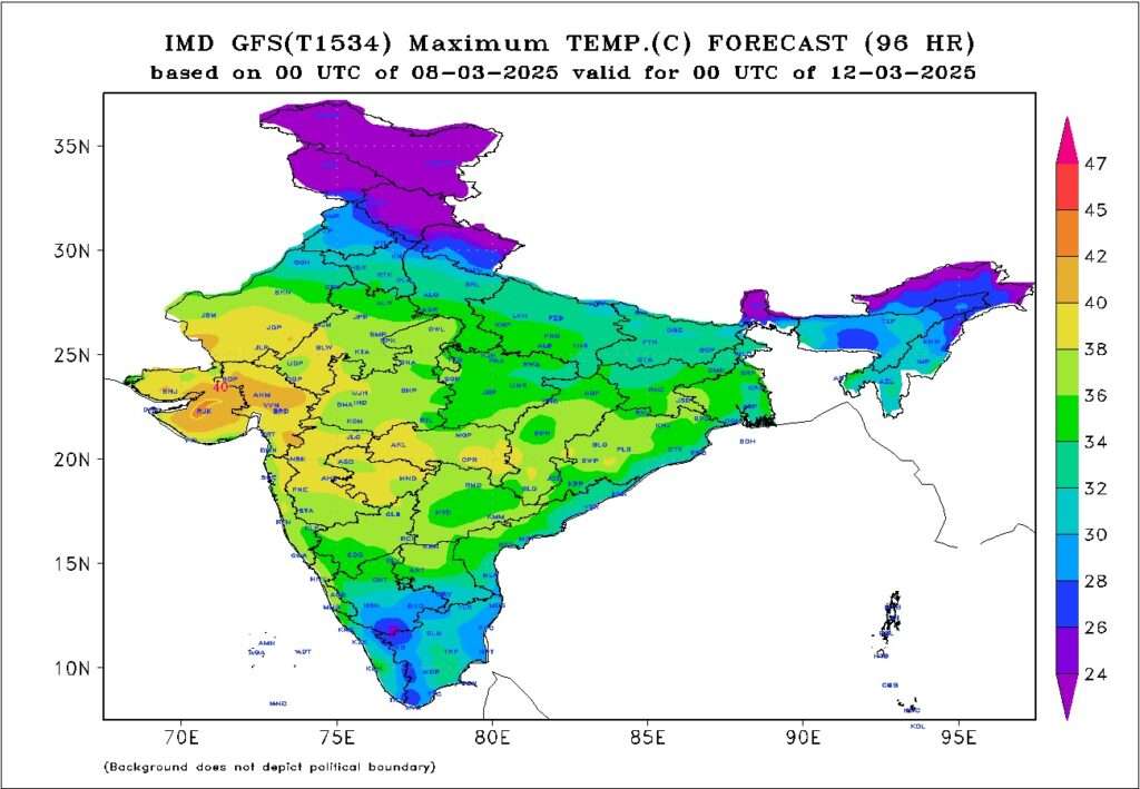 - 10th–12th March: Maximum temperatures are expected to increase further reaching range of 39°C to 42°C establishing a Heat Wave conditions over some centers of Saurashtra, Gujarat & Kutch.