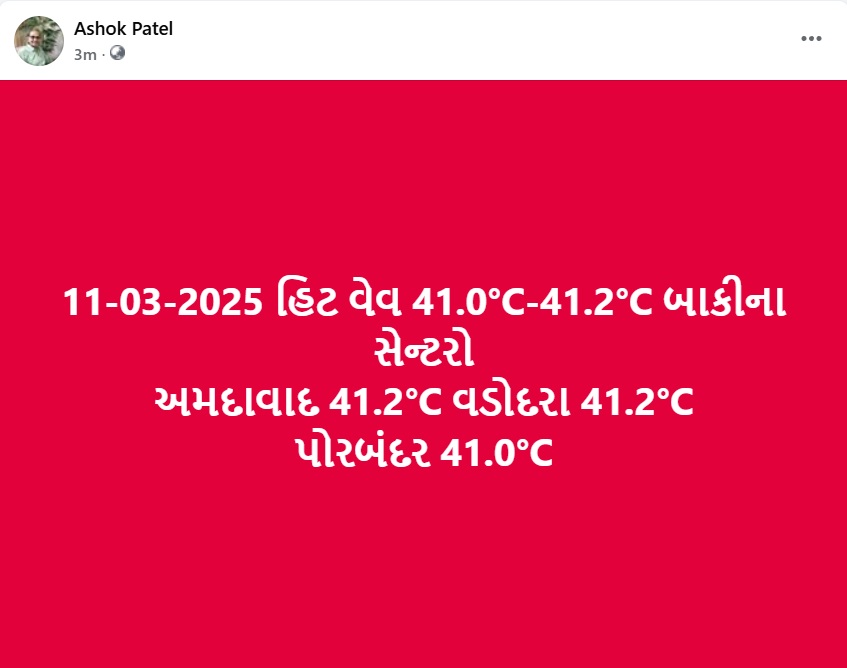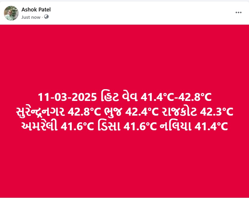 10-12 માર્ચ દરમિયાન સૌરાષ્ટ્ર, ગુજરાત અને કચ્છમાં કેટલીક જગ્યાઓ પર હીટવેવની સ્થિતિ ની શક્યતા, મહત્તમ તાપમાન રેન્જ 39°C-42°C – 13-14 માર્ચે થોડી રાહત ની અપેક્ષા