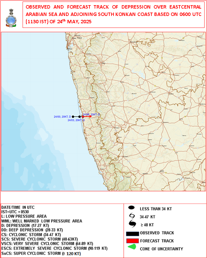 The Depression over East Central Arabian Sea and adjoining south Konkan coast moved slowly eastward with a speed of 6 kmph during past 3 hours and lay centered at 0830 Hrs IST of today, the 24th May 2025 over the same region close to south Konkan coast near latitude 17.20 N & longitude 73.20 E, about 30 km north-northwest of Ratnagiri and 70 km south of Dapoli.