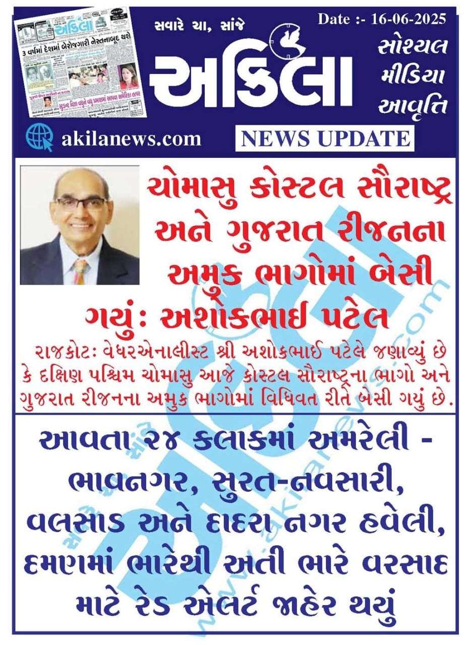 દક્ષિણ પશ્ચિમ ચોમાસું કોસ્ટલ સૌરાષ્ટ્ર ના ભાગો તેમજ ગુજરાત રિજિયન ના ભાગો માં આજે તારીખ 16th June 2025 ના પ્રવેશ્યું