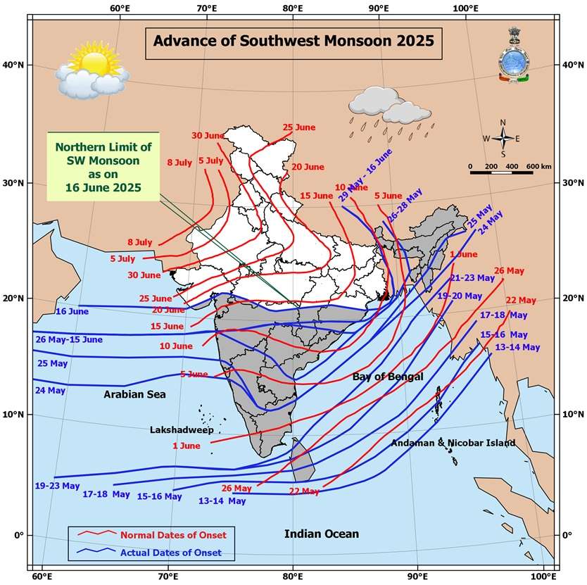 16મી જૂન 2025ની સ્થિતિ મુજબ, ચોમાસાની ઉત્તર સીમા નીચેના સ્થળોમાંથી પસાર થાય છે: