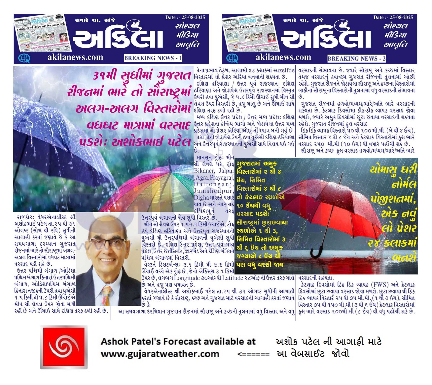 ગુજરાત રિજિયન માં ભારે વરસાદના ના રાઉન્ડ ની શક્યતા: 25th–31st August 2025 – સૌરાષ્ટ્રમાં અલગ અલગ વિસ્તાર માં વધ ઘટ માત્રામાં વરસાદની શક્યતા