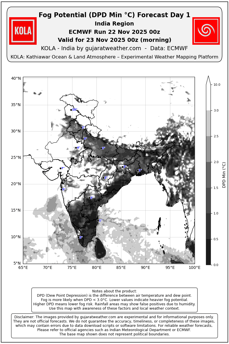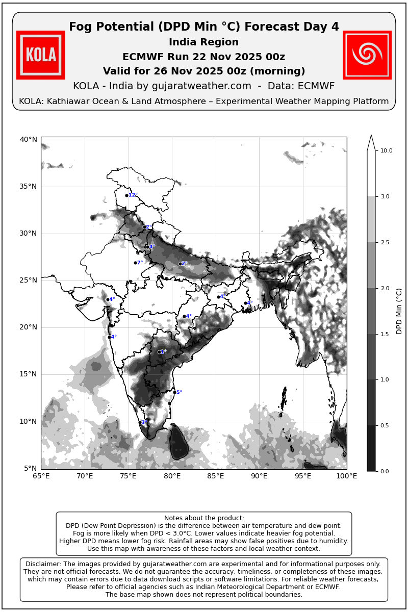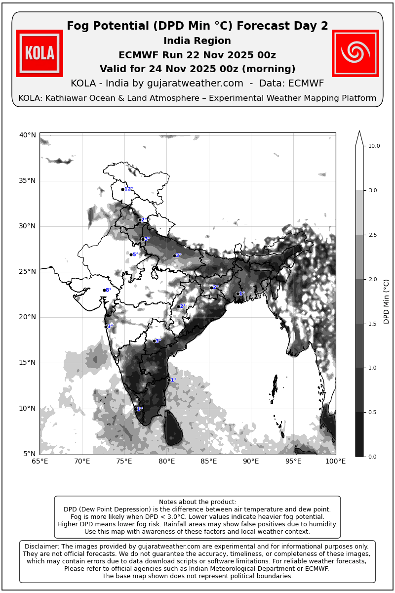 ભારતના મોટા ભાગમાં શિયાળામાં ધુમ્મસ (Fog) એક મહત્વનો હવામાન તત્વ છે, જે માર્ગ, રેલવે અને એર ટ્રાવેલને વારંવાર અસર કરે છે. ધુમ્મસની આગાહી વધુ સ્પષ્ટ બનાવવા માટે, અહીં ECMWF ઝાકળ ની શક્યતા માટે Map રજૂ કર્યો છે, જે Dew Point Depression (DPD) પર આધારિત છે.