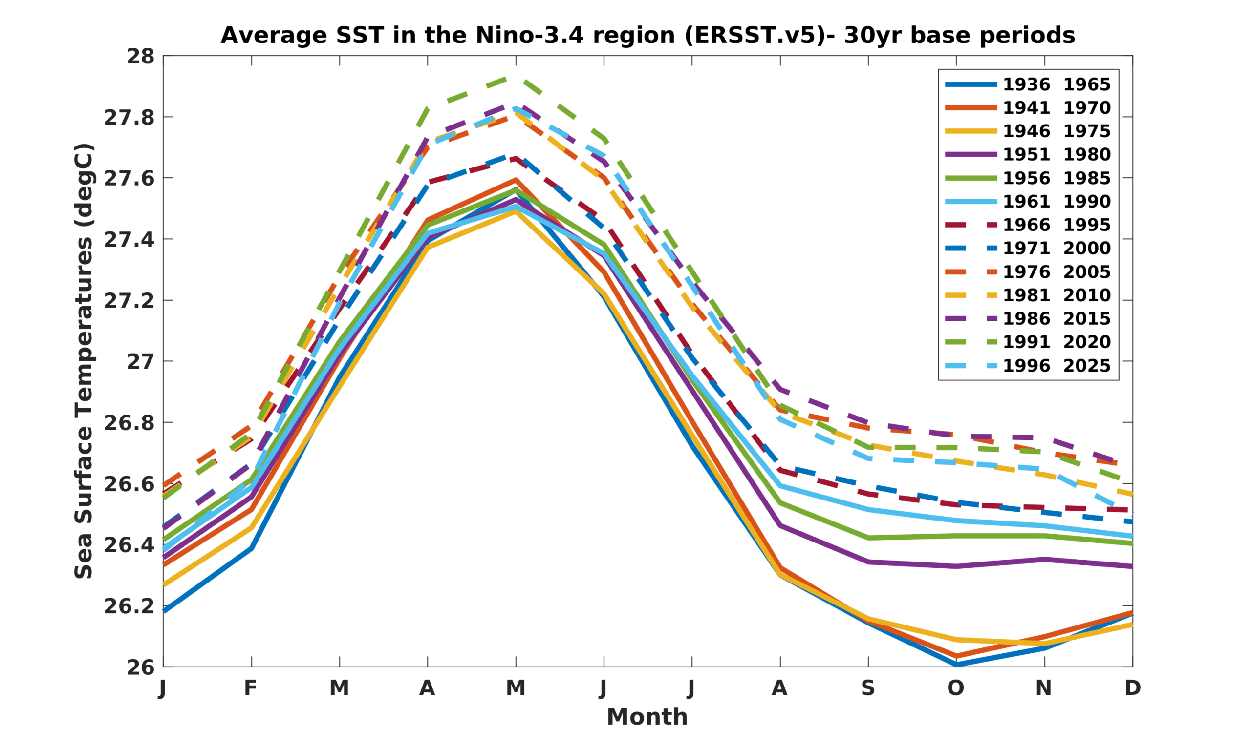 The Table below shows the monthly SST of Nino3.4 Region and the Climate adjusted normal SST and SST anomaly from April 2024. Recently revised Climate Base 1996-2025. ERSST.v5
