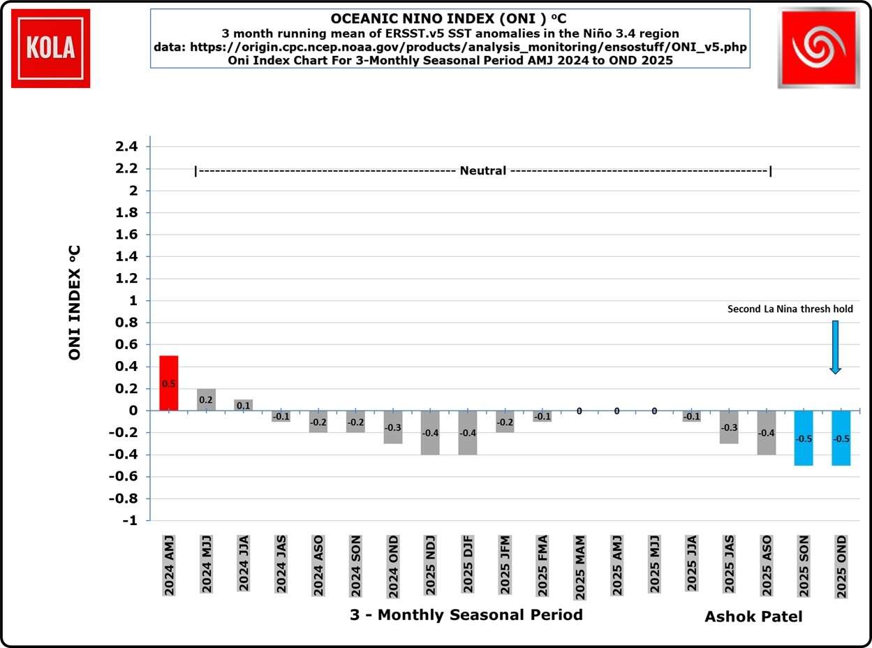 SON અને OND 2025 પ્રથમ બે યોગ્ય સમયગાળા ગણાય છે. બાકી ત્રણ ઋતુઓ—NDJ, DJF, અને JFM (2025–26)—માં પણ La Niña થ્રેશ હોલ્ડ સતત જળવાઈ રહેવી જરૂરી છે. હાલના ના અનુમાનો આ તમામ સમયગાળામાં એવી સતત La Niña થ્રેશ હોલ્ડને સમર્થન આપતા નથી.