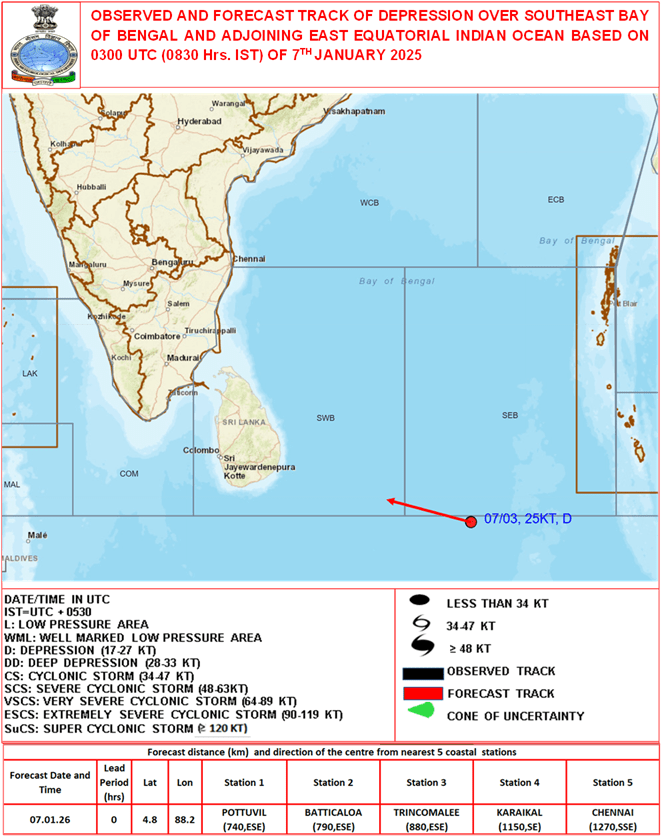 The well-marked low-pressure area over the southeast Bay of Bengal has intensified into a Depression at 0830 IST on 7 January 2026, centered near 4.8°N / 88.2°E. It is likely to intensify into a Deep Depression within 24 hours and move west-northwestwards towards the southwest Bay of Bengal over the next 48 hours.