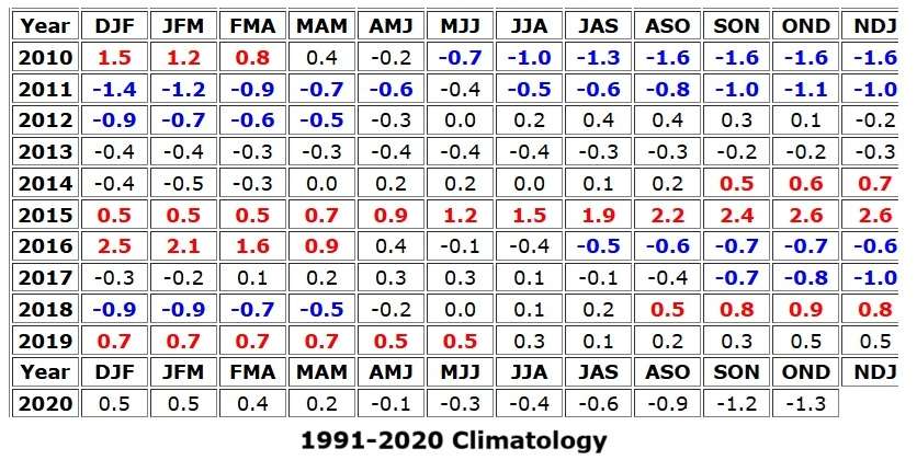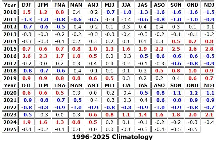 ONI સૂચકાંક Niño-3.4 વિસ્તારમાં સમુદ્ર સપાટી તાપમાનને છેલ્લા 30 વર્ષની સરેરાશ સાથે સરખાવીને નક્કી થાય છે. જ્યારે આ સરેરાશ બદલાય છે, ત્યારે “નોર્મલ”ની વ્યાખ્યા પણ બદલાય છે. આ વખતના અપડેટમાં Niño-3.4 વિસ્તારની સરેરાશ થોડું ઠંડું થઈ છે.