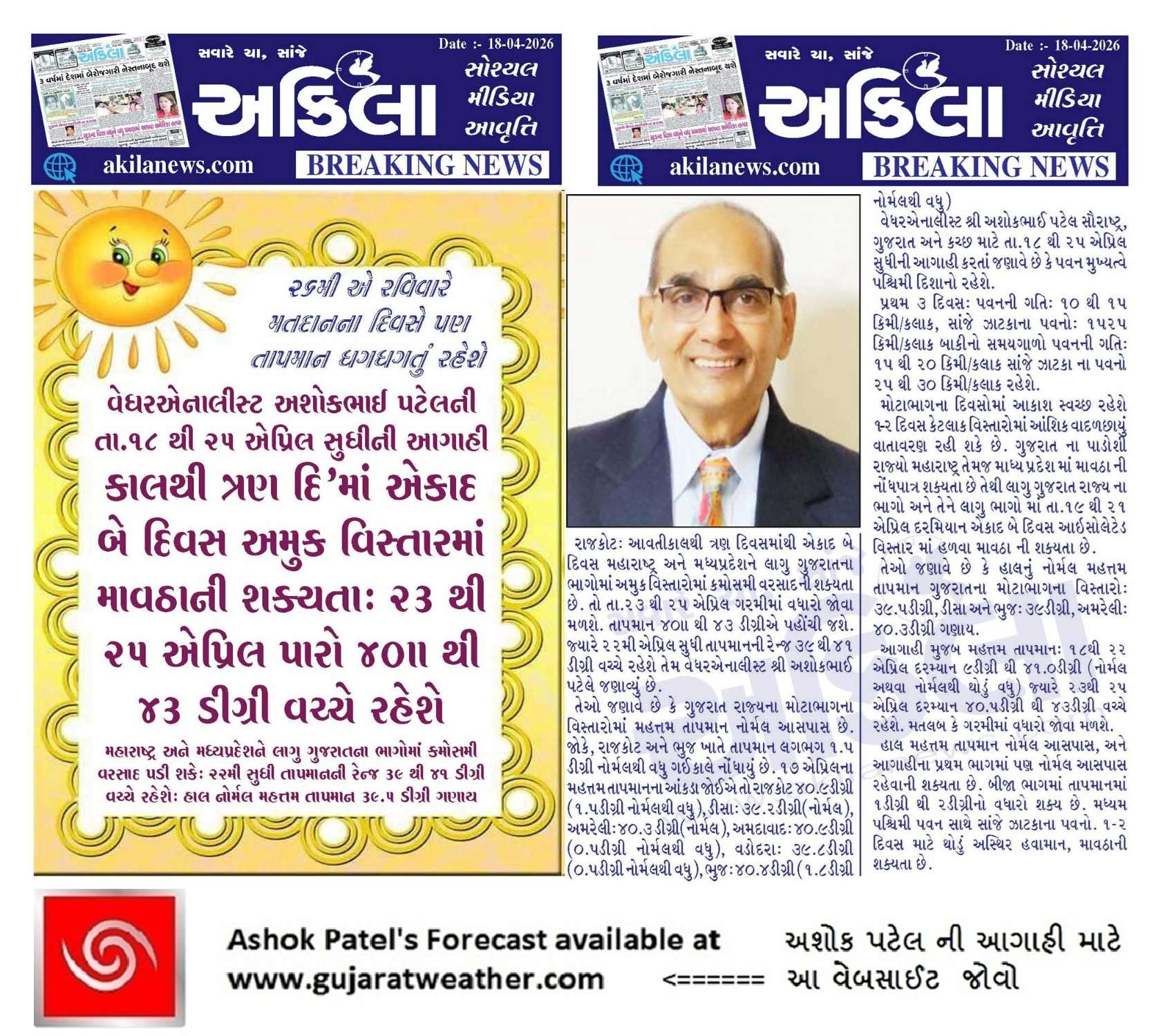 સૌરાષ્ટ્ર, ગુજરાત અને કચ્છમાં 22 એપ્રિલ સુધી મહત્તમ તાપમાન 39°C–41°C; ત્યારબાદ 23થી 25 એપ્રિલ 2026 દરમિયાન 40.5°C–43°C સુધી વધવાની શક્યતા