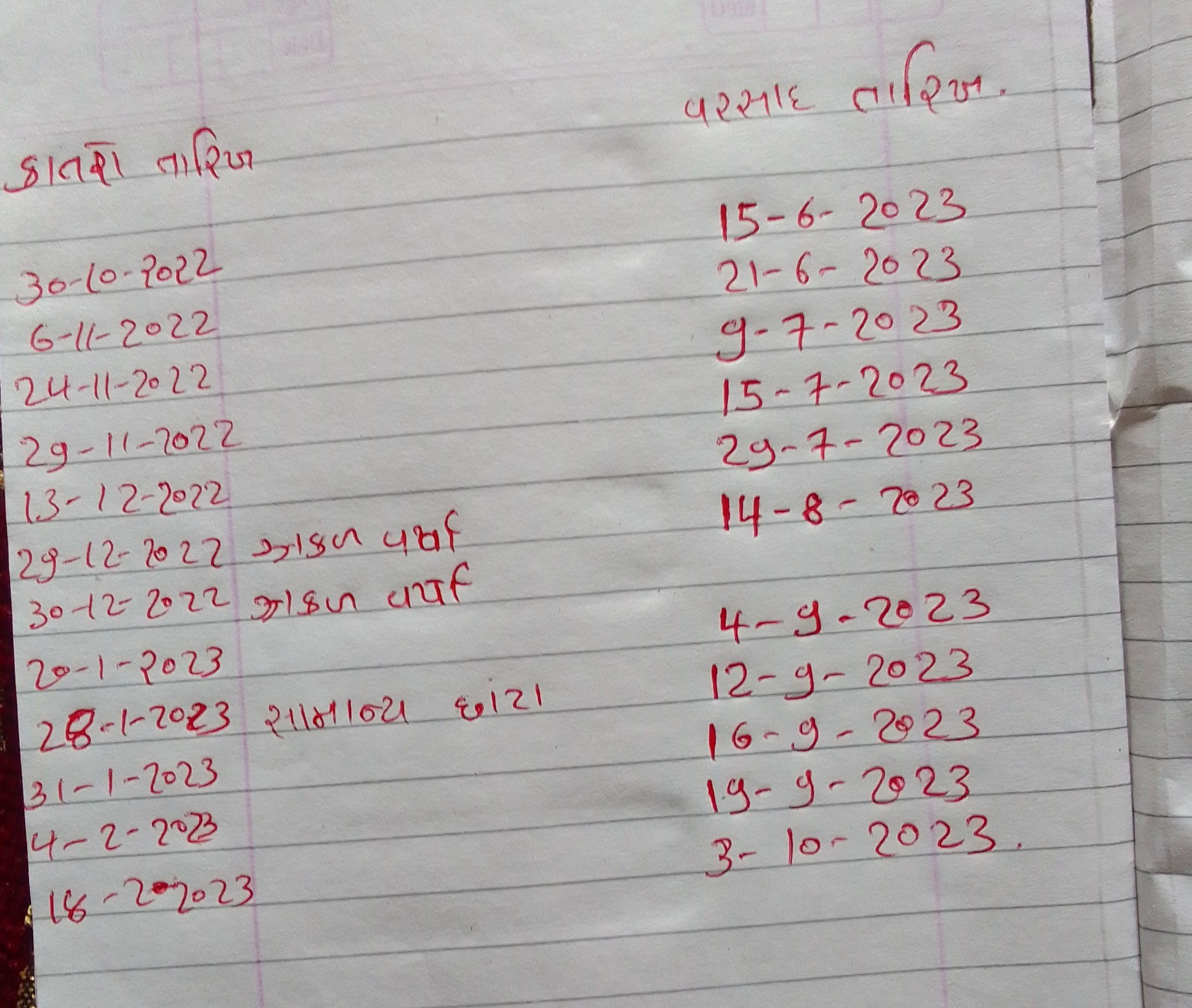 Sir me gaya varse joyel katra mujab aakha varas no varsad ni tarikh lakhi che tame permission apo to picture upload karu?