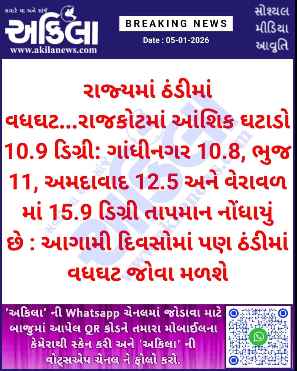 6 જાન્યુઆરી 2026 સુધીના આગાહી સમયગાળા દરમિયાન સૌરાષ્ટ્ર, ગુજરાત અને કચ્છમાં લઘુત્તમ તાપમાનમાં ઉપર નીચે વધ ઘટ થવાની શક્યતા – પશ્ચિમી વિક્ષેપ ઉત્તર ભારતને અસર કરશે