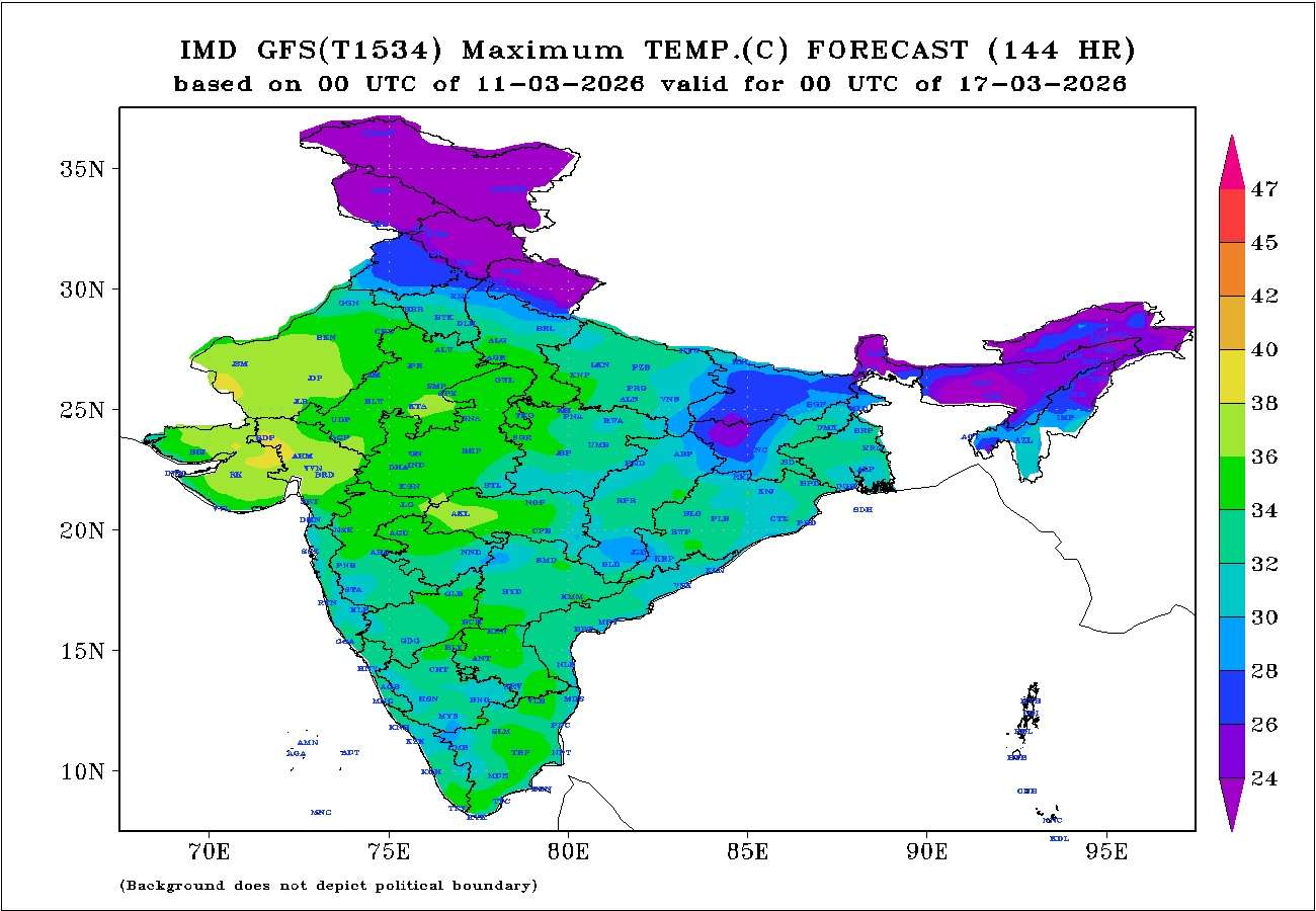 Normal maximum temperatures for the forecast period across most parts of Gujarat are around 35°C to 36°C.