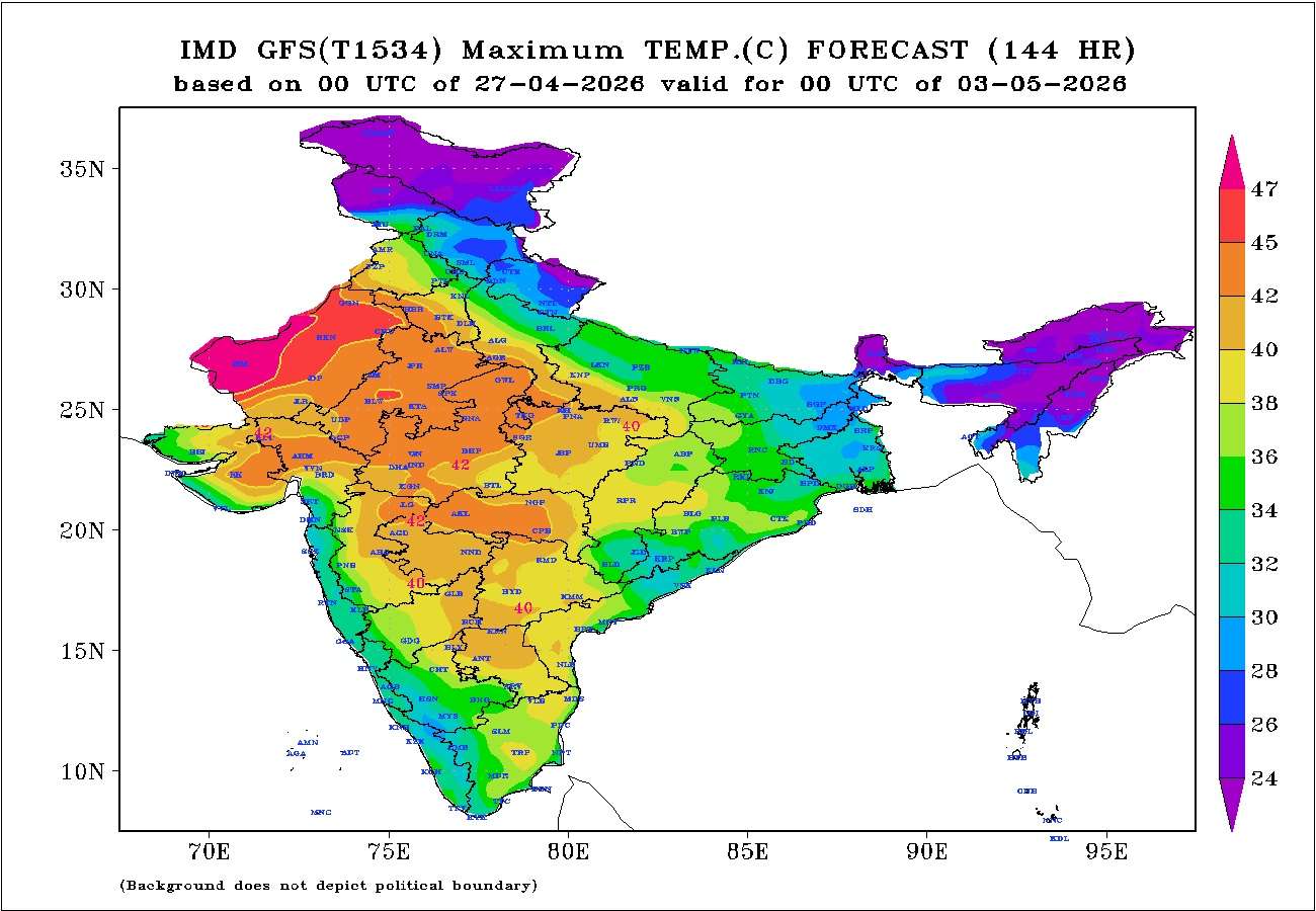 સૌરાષ્ટ્ર, ગુજરાત અને કચ્છના ગરમ કેન્દ્રોમાં મહત્તમ તાપમાન 27 એપ્રિલથી 3 મે 2026 દરમિયાન 41°C થી 44°C ની રેન્જમાં રહેવાની શક્યતા