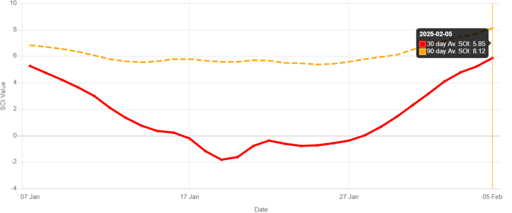 The 30 Days average SOI for end of January 2025 was in the neutral zone at 2.19, however, on 5th February 2025 it has increased and is still in neutral zone at +5.85 as per The Long Paddock – Queensland Government. The 90 Days average SOI has also increased to +8.12 on 5th February 2025.