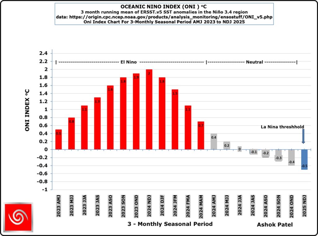 The Niño3.4 SST has been recorded at -0.25°C for November 2024, -0.60°C for December 2024 and -0.76°C for January 2025. This gives the Oceanic Niño Index (ONI) of -0.5°C for (November-December-January) 2024-25 season, thereby attaining the First La Nina threshold at the end of January 2025.