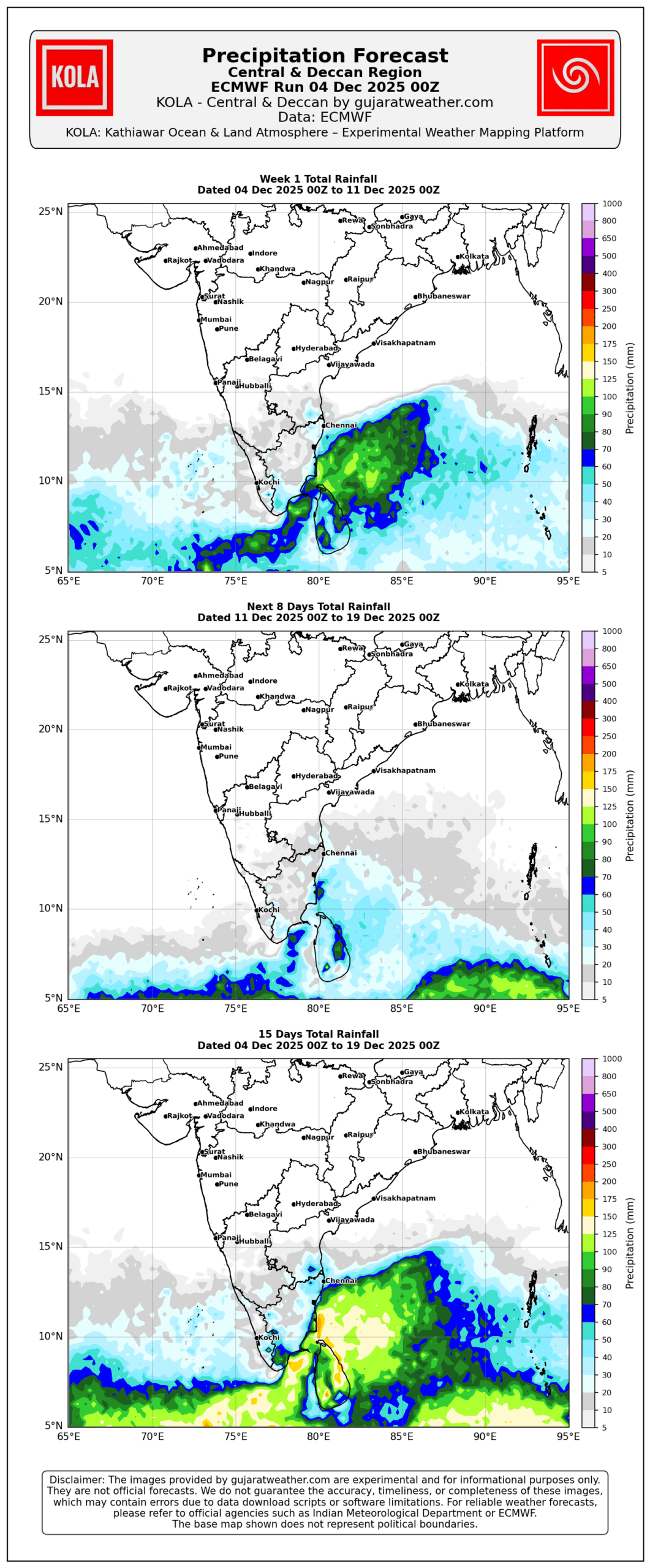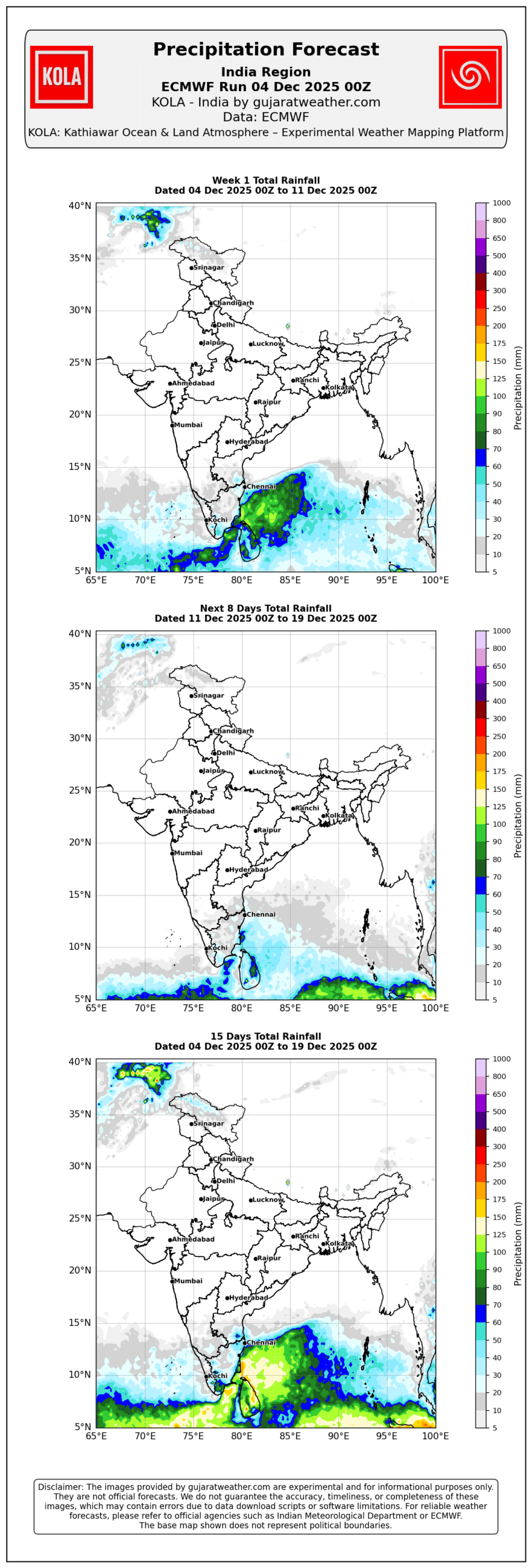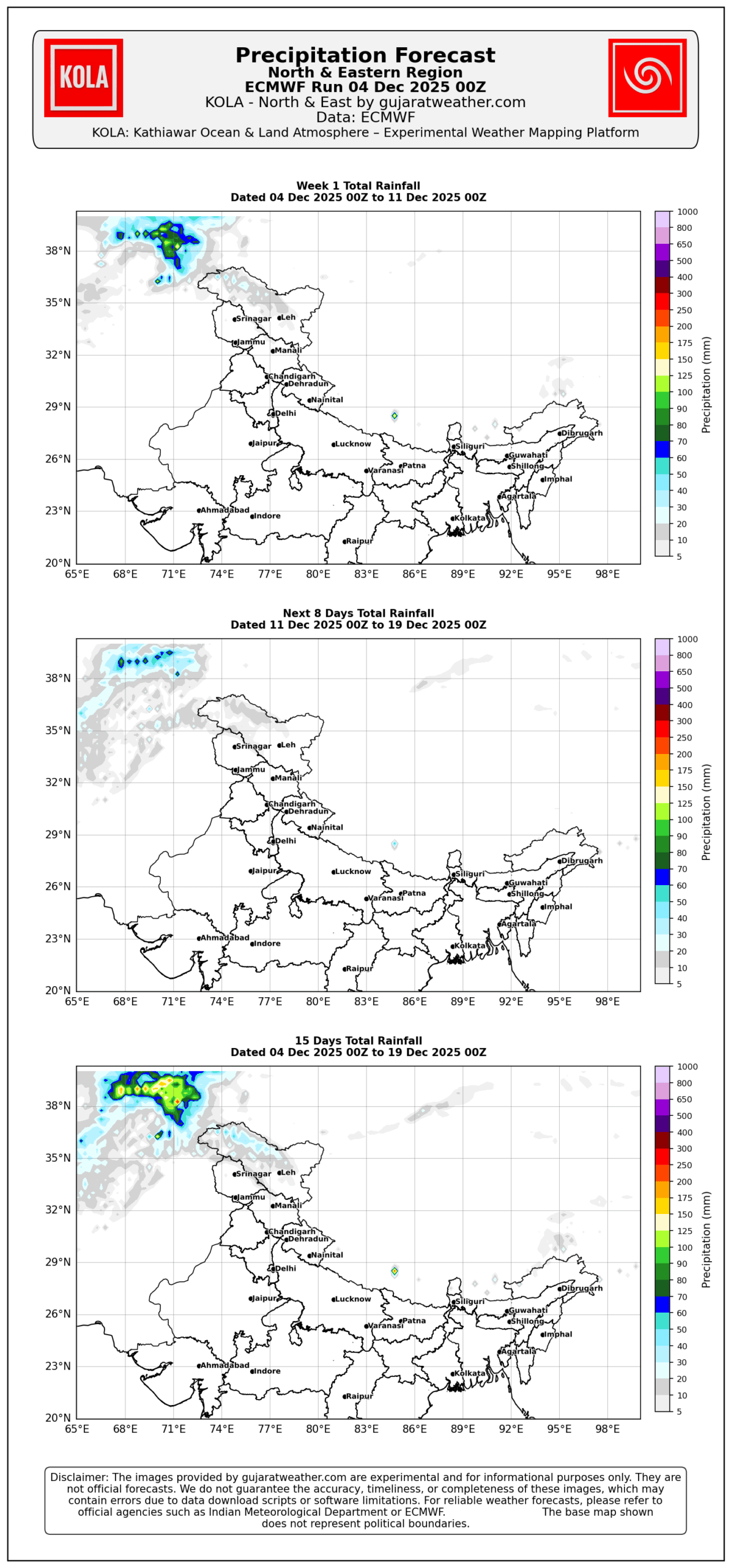 KOLA ECMWF 15 Days Precipitation Charts KOLA India Animation https://www.gujaratweather.com/wp-content/uploads/2025/12/kola_ecmwf_india_15days_animation_04122025_00Z.mp4 KOLA North & East Animation https://www.gujaratweather.com/wp-content/uploads/2025/12/kola_ecmwf_ne_15days_animation_04122025_00Z.mp4 KOLA Central & Deccan Animation https://www.gujaratweather.com/wp-content/uploads/2025/12/kola_ecmwf_cd_15days_animation_04122025_00Z.mp4 KOLA India KOLA North & East KOLA Central & Deccan