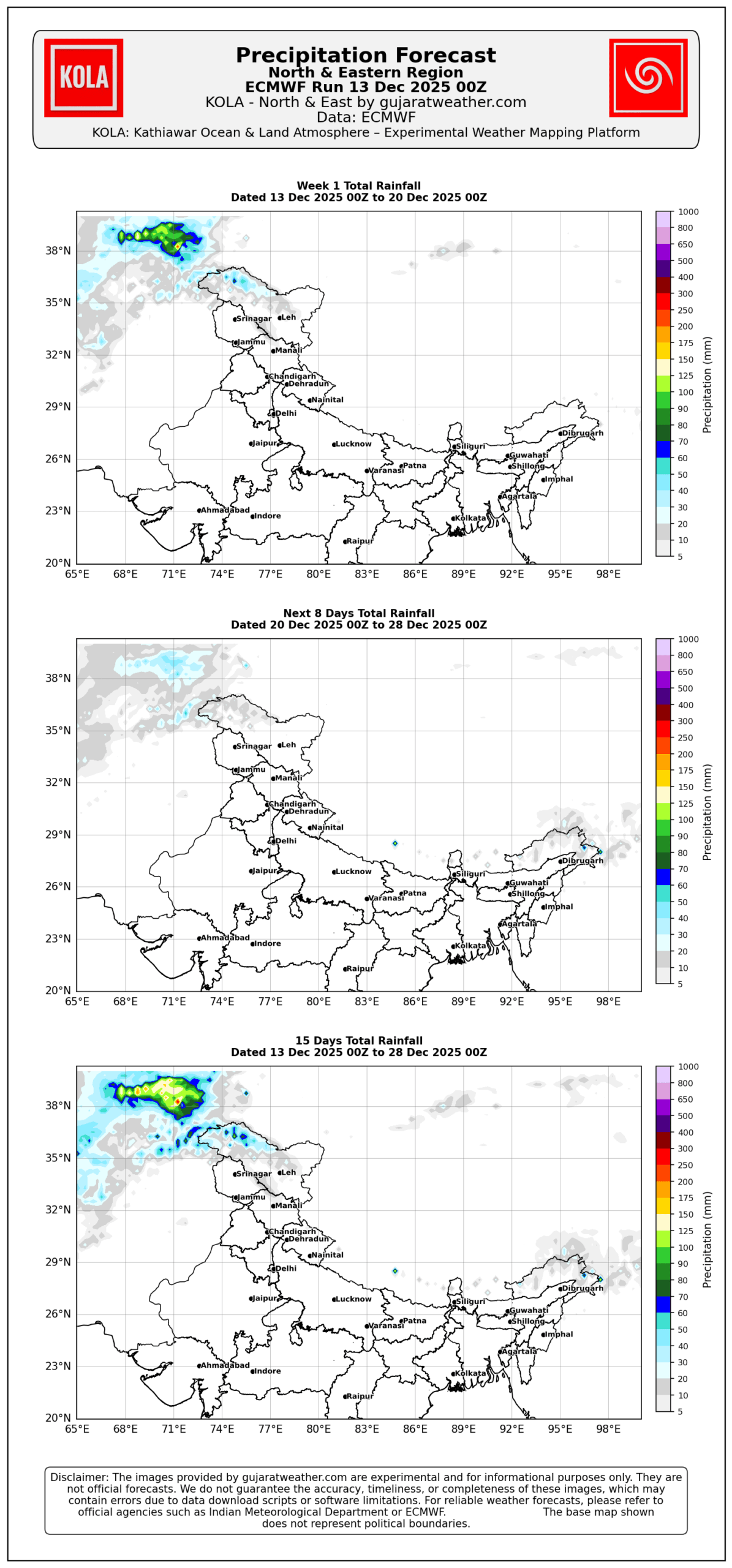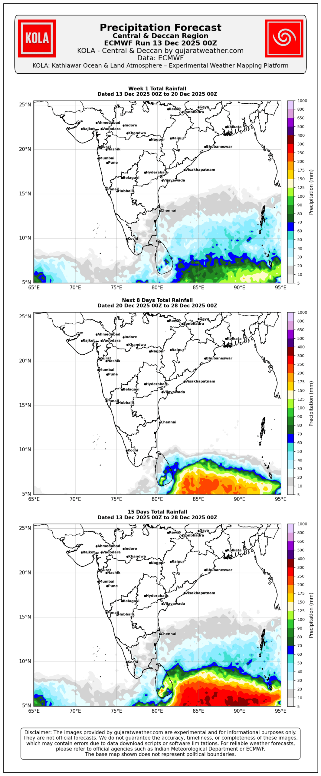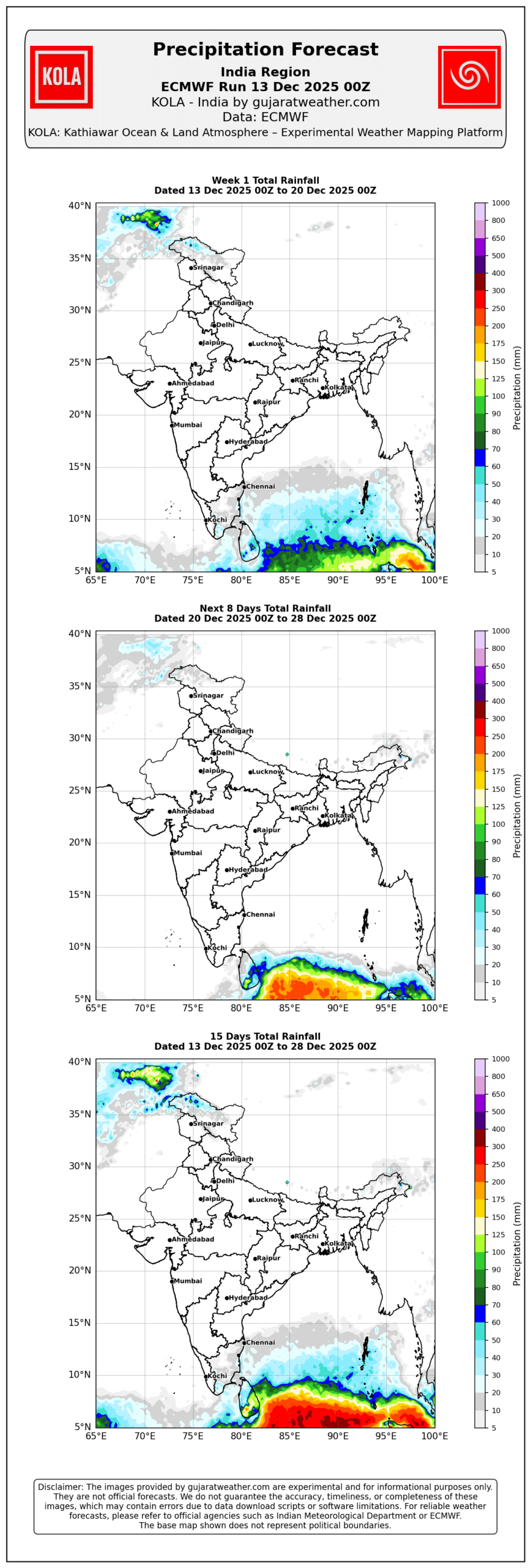 KOLA ECMWF 15 Days Precipitation Charts KOLA India Animation https://www.gujaratweather.com/wp-content/uploads/2025/12/kola_ecmwf_india_15days_animation_13122025_00Z.mp4 KOLA North & East Animation https://www.gujaratweather.com/wp-content/uploads/2025/12/kola_ecmwf_ne_15days_animation_13122025_00Z.mp4 KOLA Central & Deccan Animation https://www.gujaratweather.com/wp-content/uploads/2025/12/kola_ecmwf_cd_15days_animation_13122025_00Z.mp4 KOLA India KOLA North & East KOLA Central & Deccan