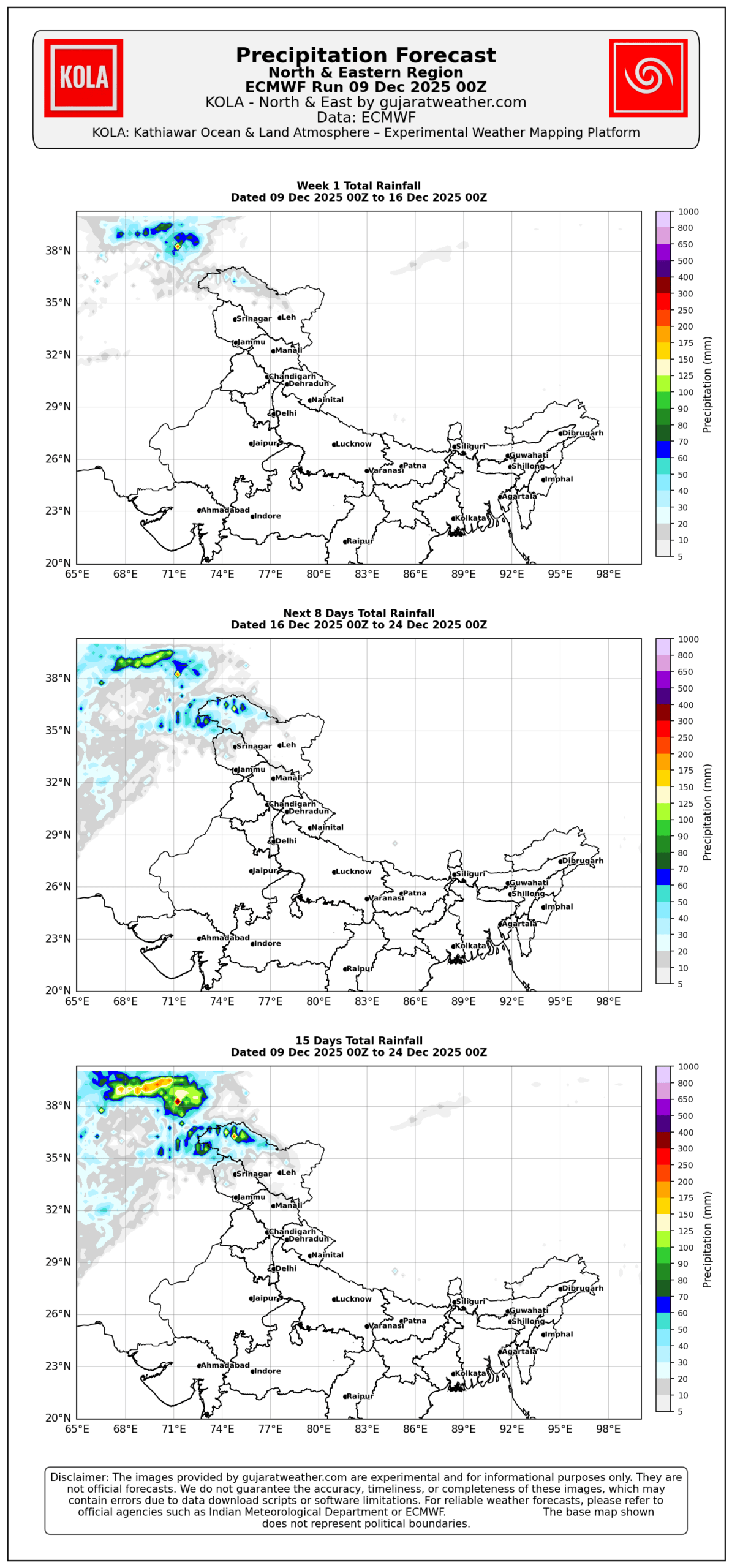 KOLA ECMWF 15 Days Precipitation Charts KOLA India Animation https://www.gujaratweather.com/wp-content/uploads/2025/12/kola_ecmwf_india_15days_animation_09122025_00Z.mp4 KOLA North & East Animation https://www.gujaratweather.com/wp-content/uploads/2025/12/kola_ecmwf_ne_15days_animation_09122025_00Z.mp4 KOLA Central & Deccan Animation https://www.gujaratweather.com/wp-content/uploads/2025/12/kola_ecmwf_cd_15days_animation_09122025_00Z.mp4 KOLA India KOLA North & East KOLA Central & Deccan