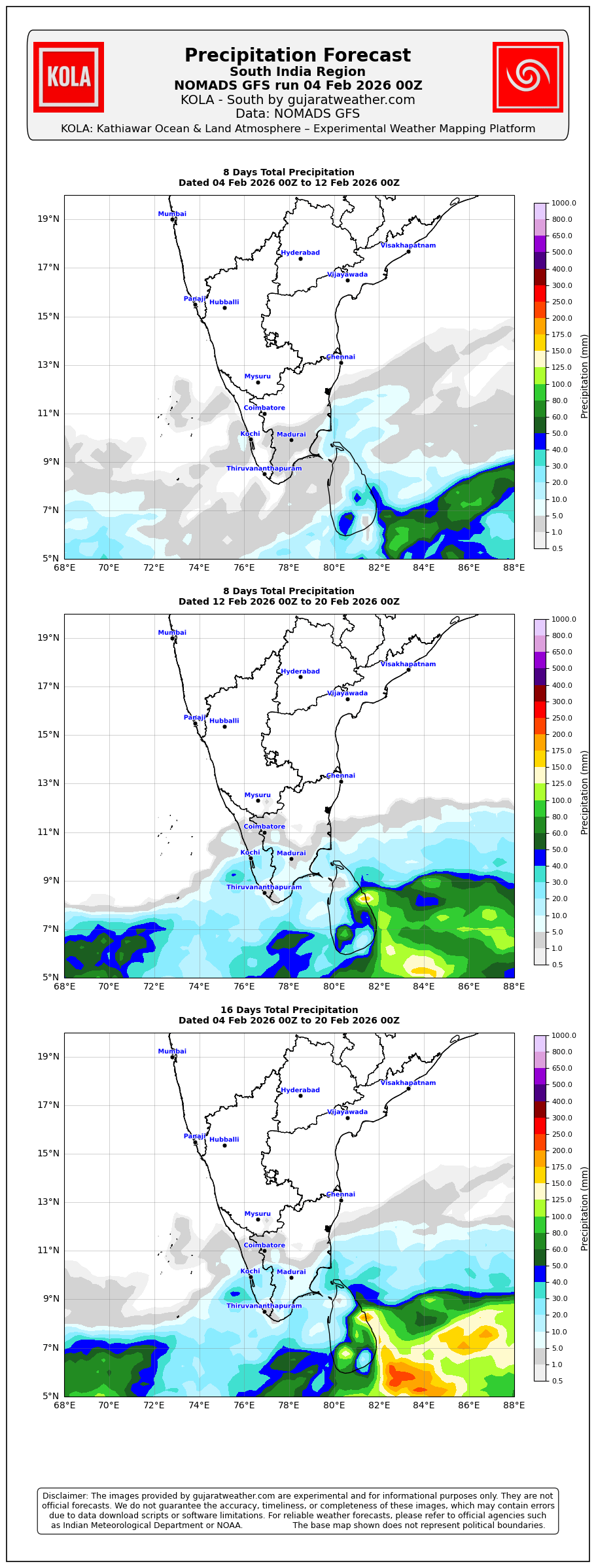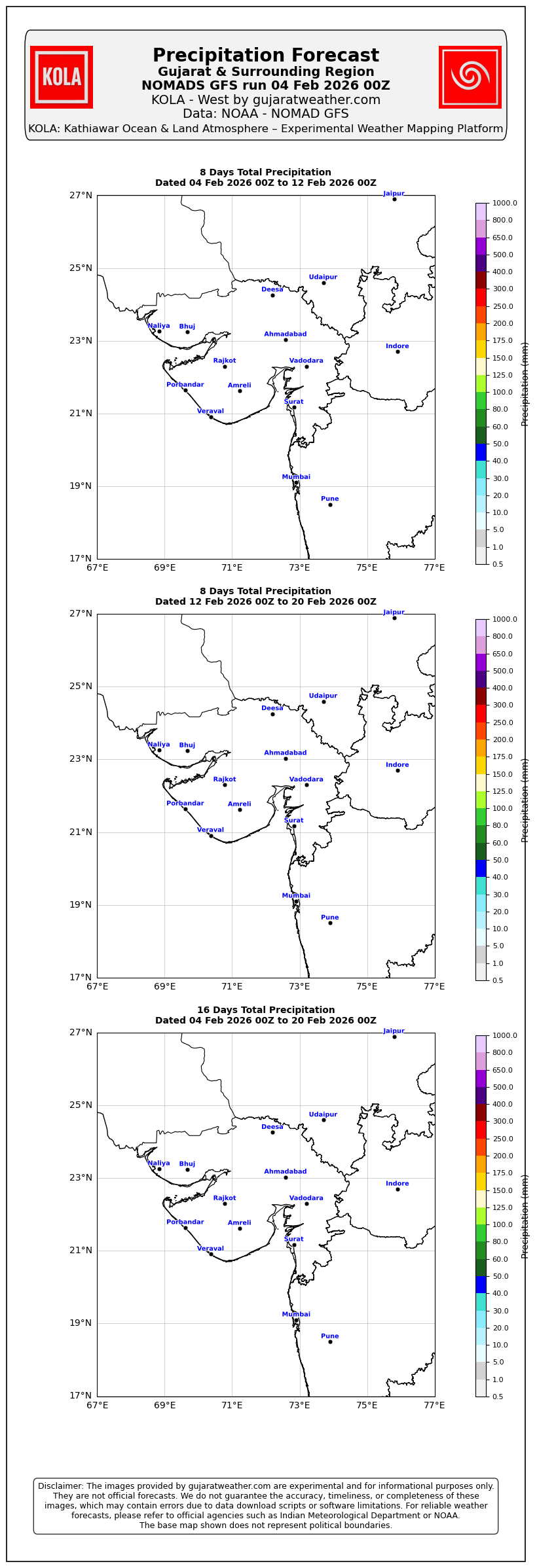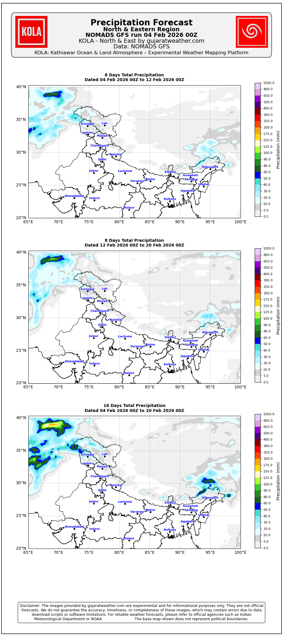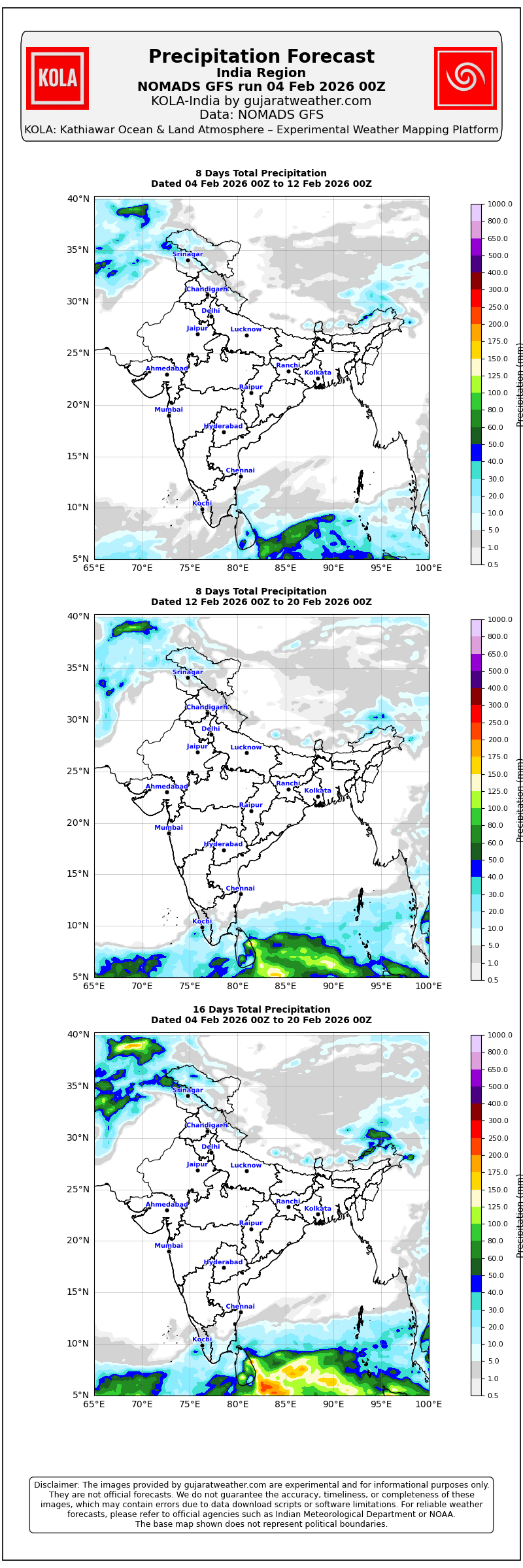 KOLA NOMADS GFS Precipitation Charts ⬇️ India MP4 ⬇️ N&E MP4 ⬇️ South MP4 ⬇️ West MP4 ⬇️ India PDF ⬇️ N&E PDF ⬇️ South PDF ⬇️ West PDF KOLA India Animation https://www.gujaratweather.com/wp-content/uploads/2026/02/kola_gfs_nomad_16days_india_20260204_00Z.mp4 KOLA North & East Animation https://www.gujaratweather.com/wp-content/uploads/2026/02/kola_gfs_nomad_16days_ne_20260204_00Z.mp4 KOLA South Animation https://www.gujaratweather.com/wp-content/uploads/2026/02/kola_gfs_nomad_16days_south_20260204_00Z.mp4 KOLA West Animation https://www.gujaratweather.com/wp-content/uploads/2026/02/kola_gfs_nomad_16days_west_20260204_00Z.mp4 KOLA India KOLA North & East KOLA South KOLA West