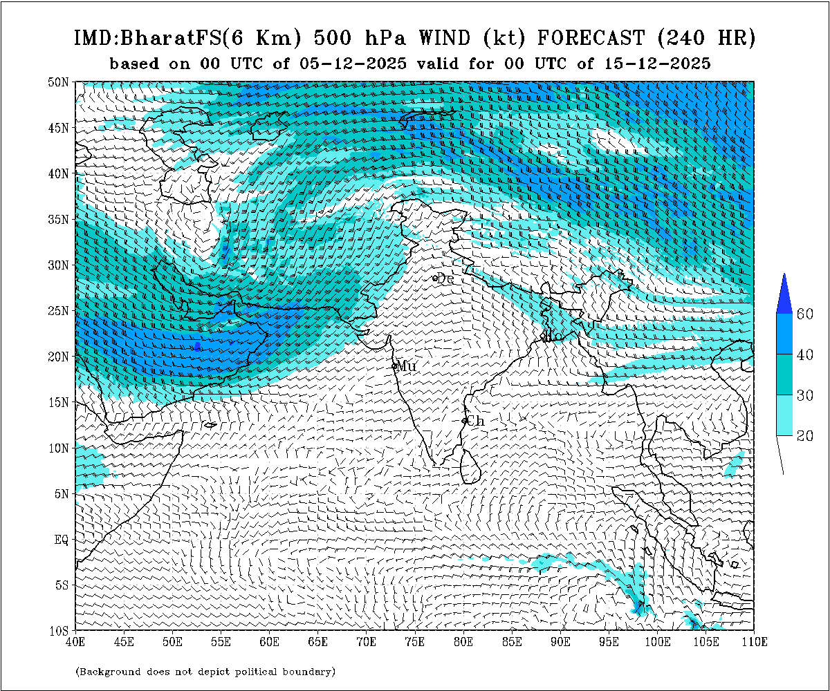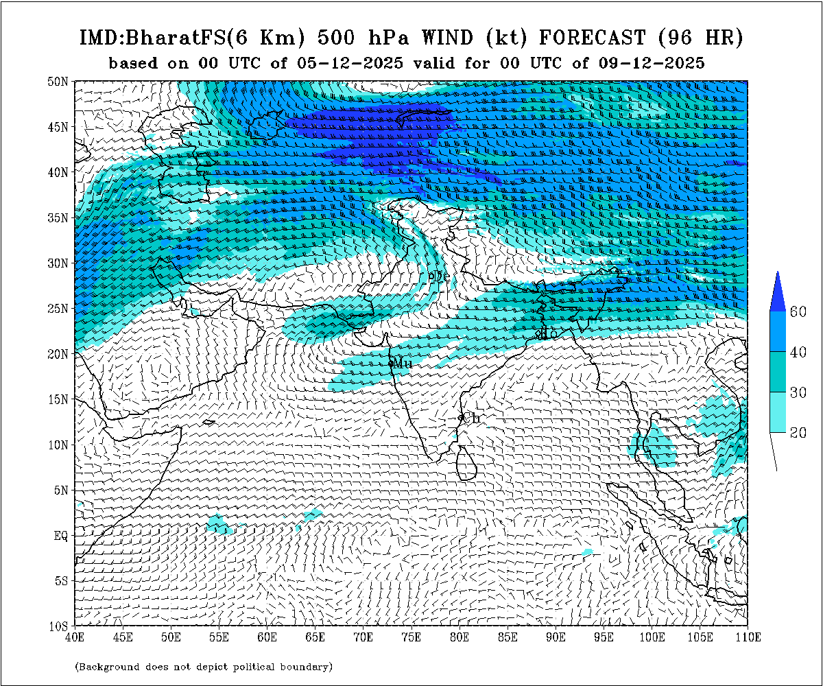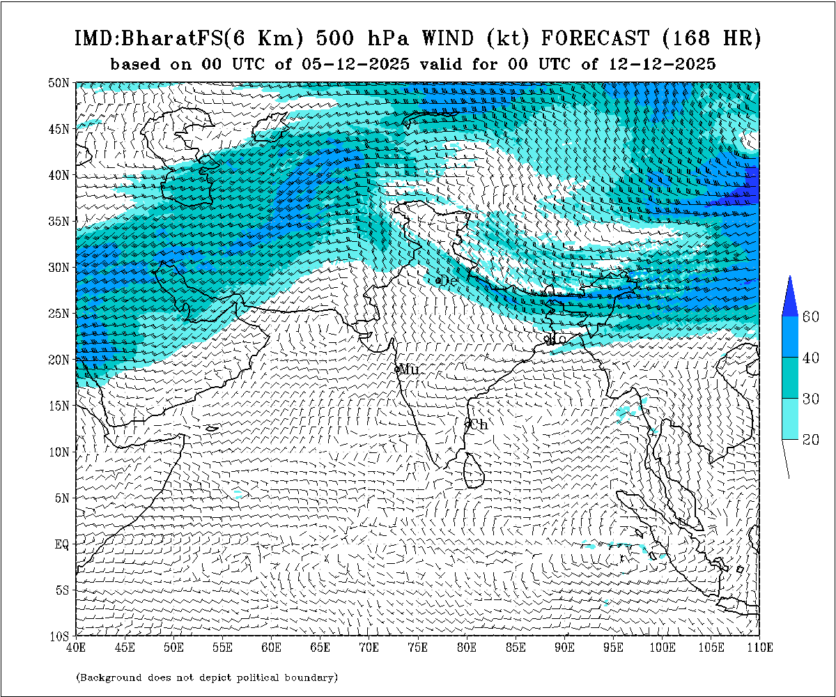 નોંધ: ચાર્ટ માં એક કોઠો આપેલ છે જેમાં વિવિદ્ધ કલર પવનો ની સ્પીડ સી લેવલ થી 5.8 km ની ઉંચાઇએ નોટ માં દર્શાવે છે. 1 નોટ = 1.852 કિમી/કલાક